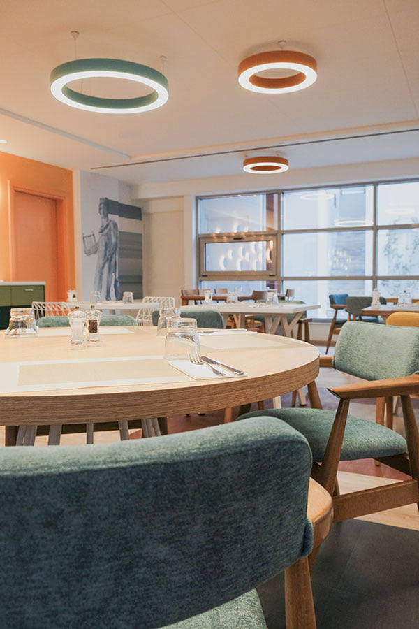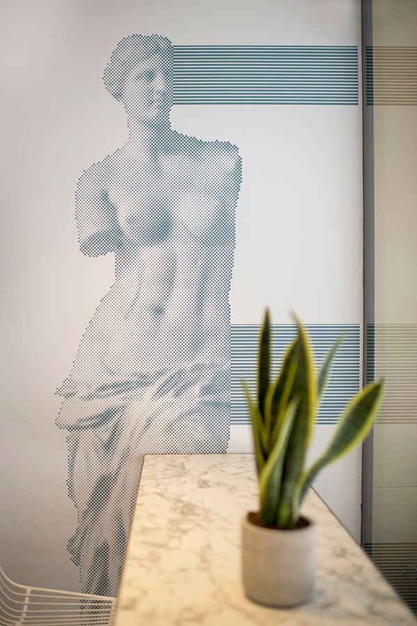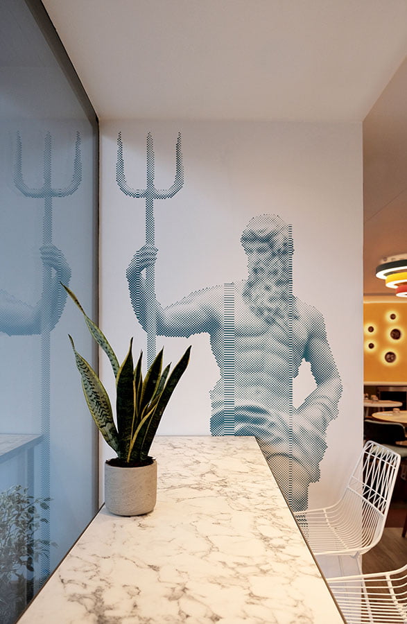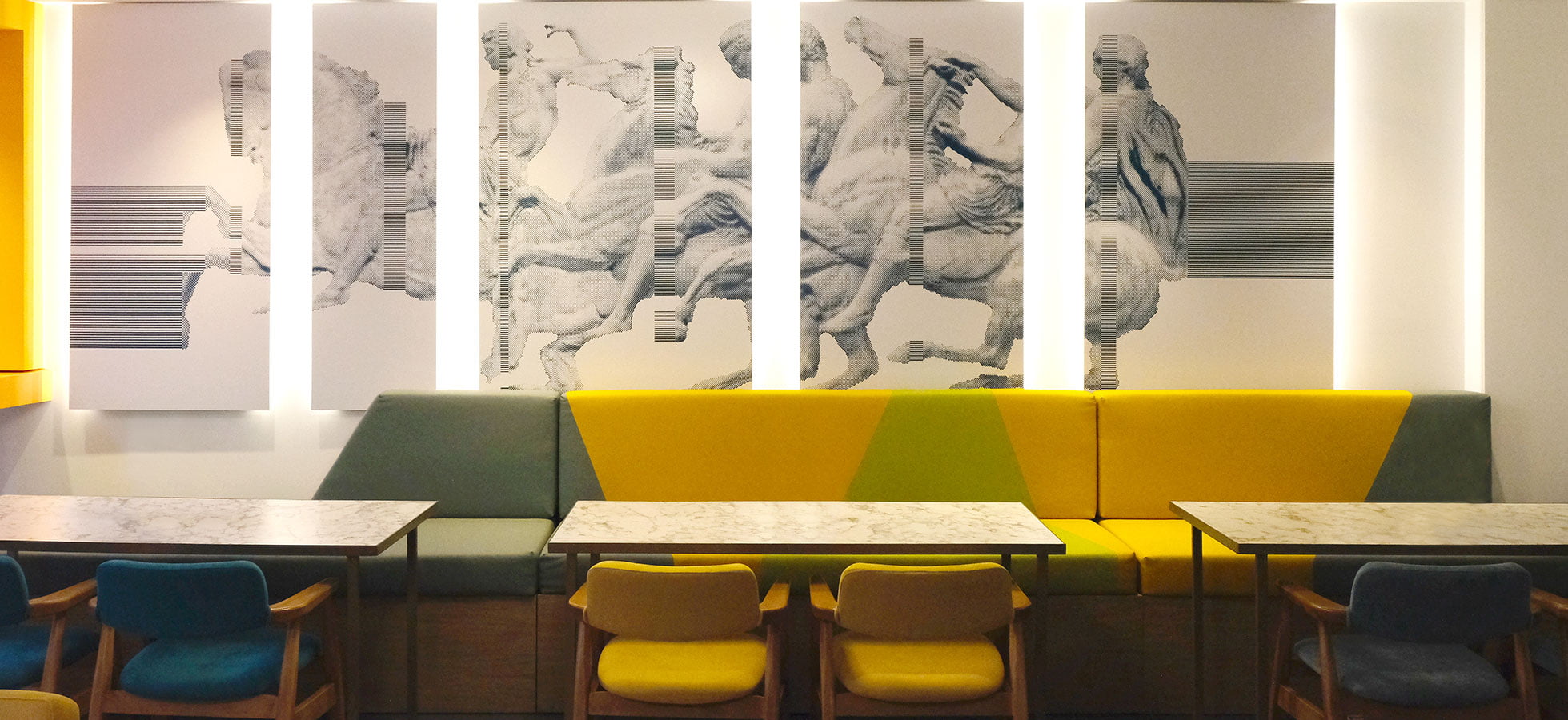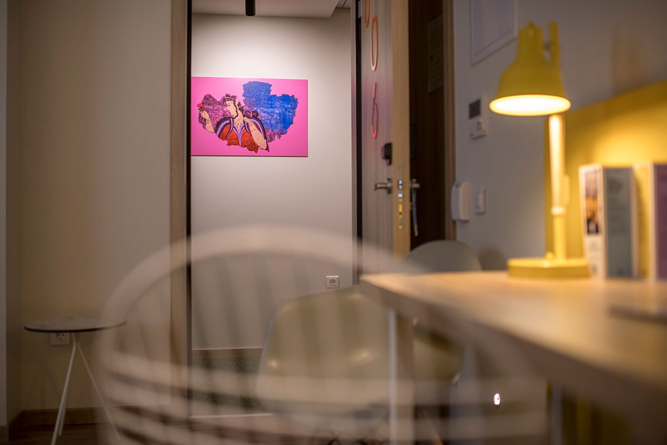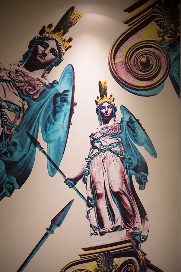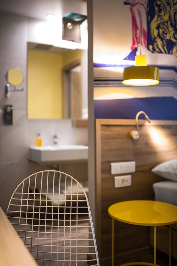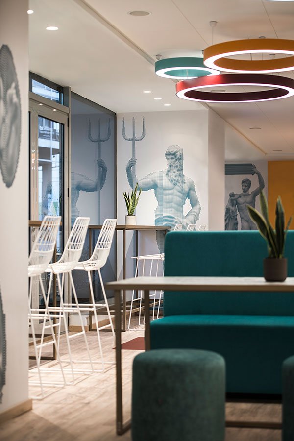 Οι προτάσεις της εσωτερικής διαμόρφωσης βασίζονται στον funky χαρακτήρα της αλυσίδας IBIS Styles, στα έντονα χρώματα που εναλλάσσονται μεταξύ των κοινόχρηστων και ιδιωτικών χώρων αλλά κυρίως στη θεματική του ξενοδοχείου βασισμένη στις αρχαίες ρίζες της πόλης των Αθηνών. Το αίθριο το οποίο είναι ανοιχτό στους επισκέπτες, περιβάλλεται από την κύρια σάλα του ξενοδοχείου και είναι σχεδιασμένο σε πιο ήπιους τόνους και με αρκετή βλάστηση αφού έχει διαμορφωθεί ως φυτεμένο δώμα.