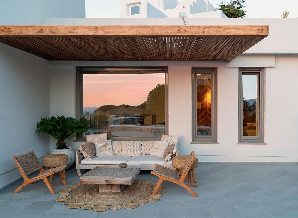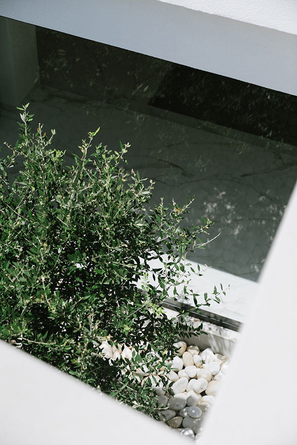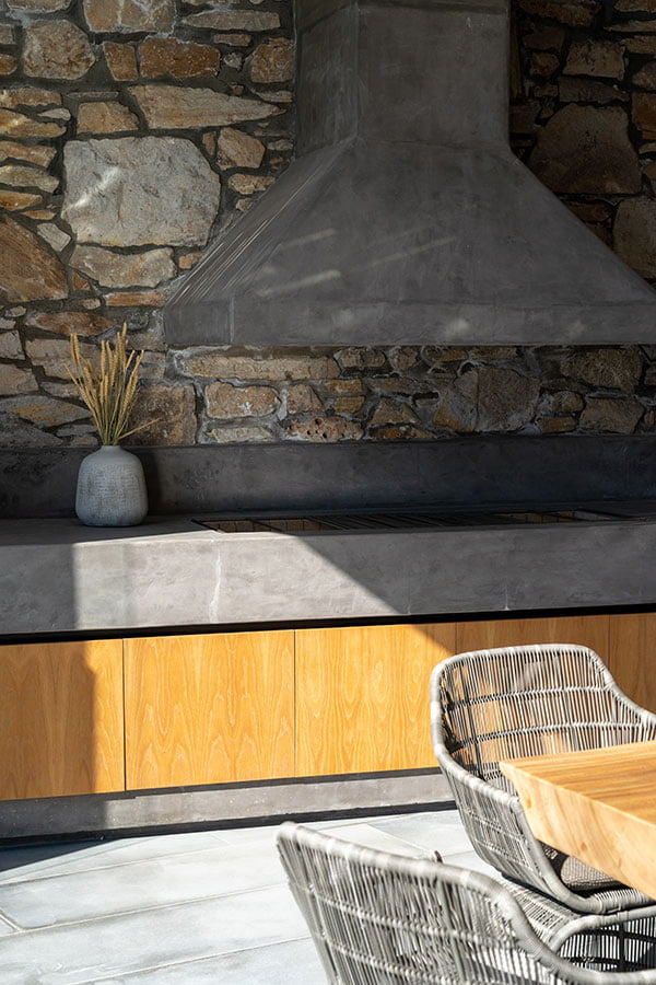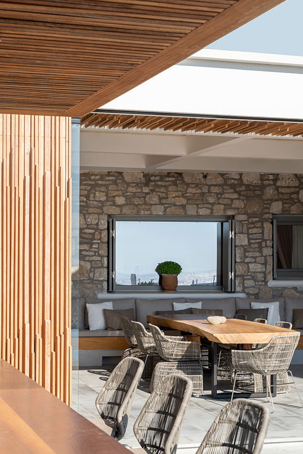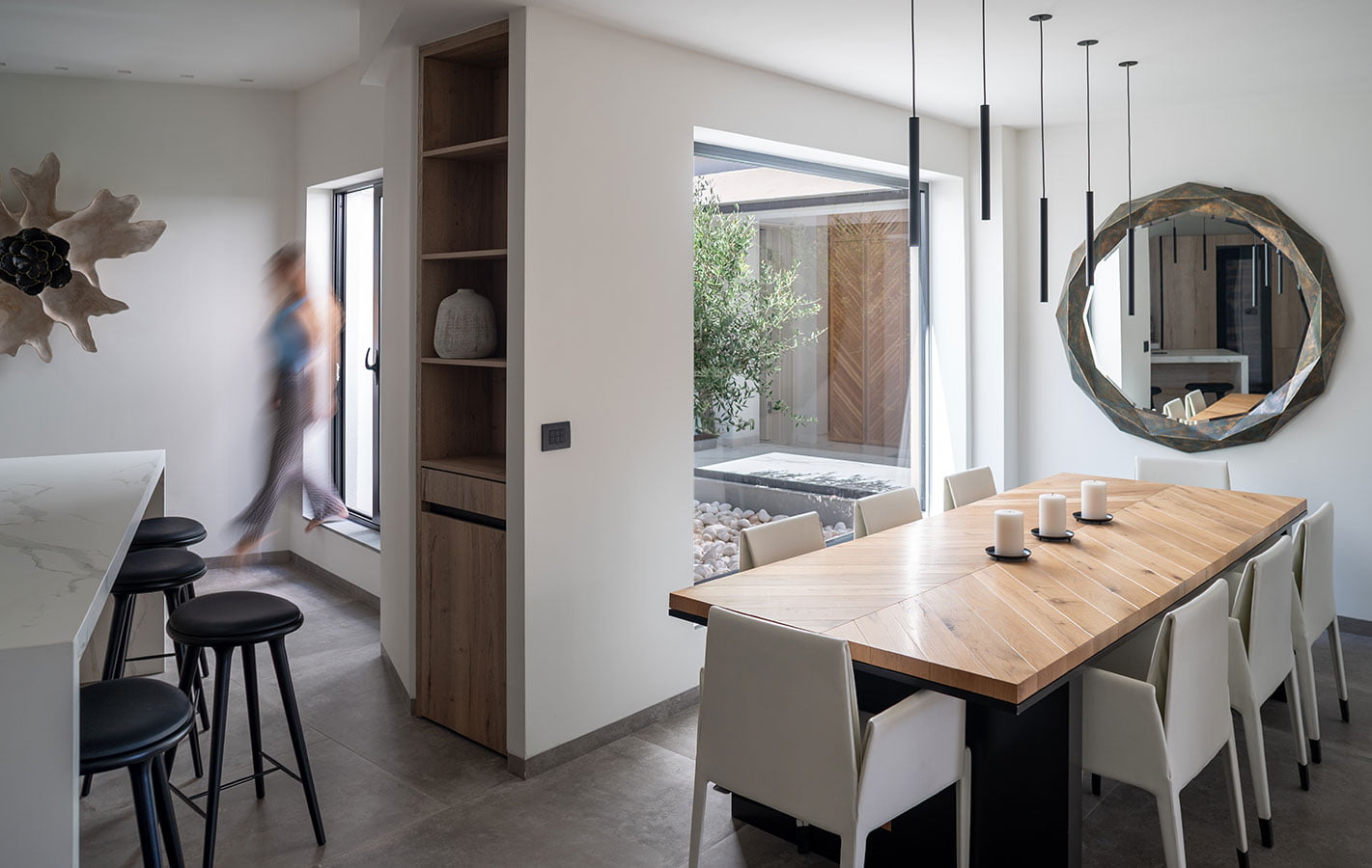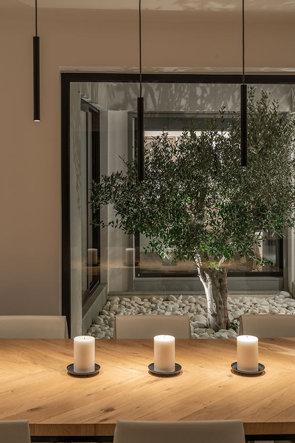 Βασική συνθετική αρχή είναι ο επανασχεδιασμός της κατοικίας έτσι ώστε οι χώροι να συνδεθούν με εσωτερικές κινήσεις, καθώς επίσης και η δημιουργία μιας μικρής εσωτερικής αυλής στην αρχική θέση της δεξαμενής συλλογής όμβριων υδάτων. Αυτό το μικρό αίθριο στον πυρήνα της σύνθεσης γίνεται σημείο αναφοράς της κατοικίας, ενώ διοχετεύει με φως το εσωτερικό των χώρων που διαρθρώνονται περιμετρικά του, αλλά προσφέρει και φυσικό εξαερισμό και δροσισμό σε αυτούς. Όσον αφορά την εσωτερική διαρρύθμιση, οι προτεινόμενοι χώροι έχουν αναφορές στην κυκλαδίτικη αρχιτεκτονική, η οποία εδώ αποδίδεται με σύγχρονες γραμμές. Οι τοίχοι καλύπτονται με λευκό χρώμα, ενώ τα δάπεδα με κεραμικά πλακίδια μεγάλων διαστάσεων σε ανοιχτό γκρι χρώμα. Ένα ακόμη βασικό υλικό είναι το ξύλο σε φυσική απόχρωση, που χρησιμοποιείται κυρίως σε custom κατασκευές επίπλων και επενδύσεις τοίχων.
