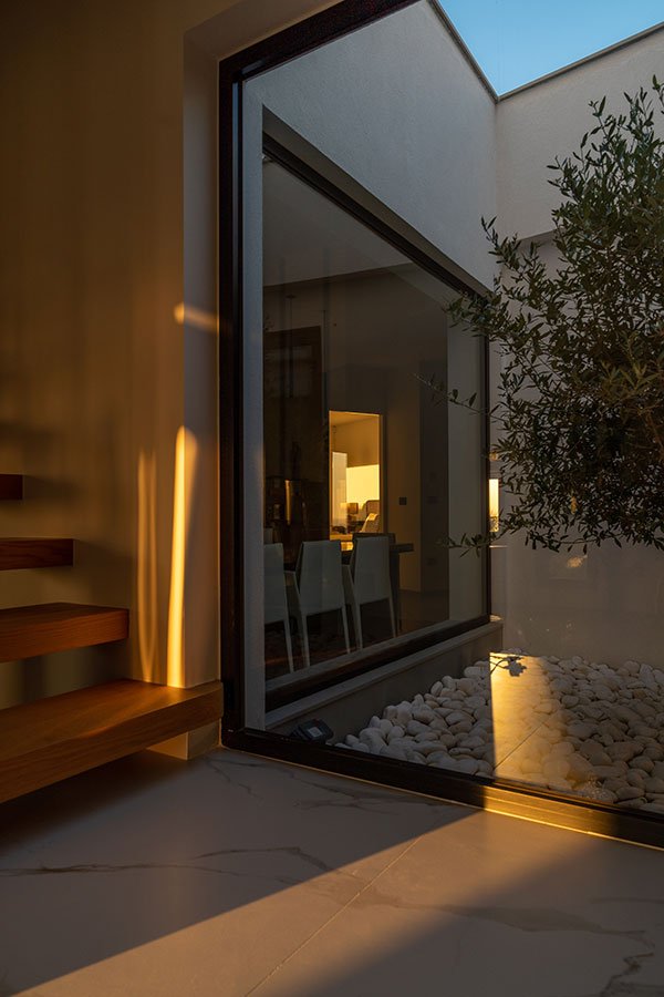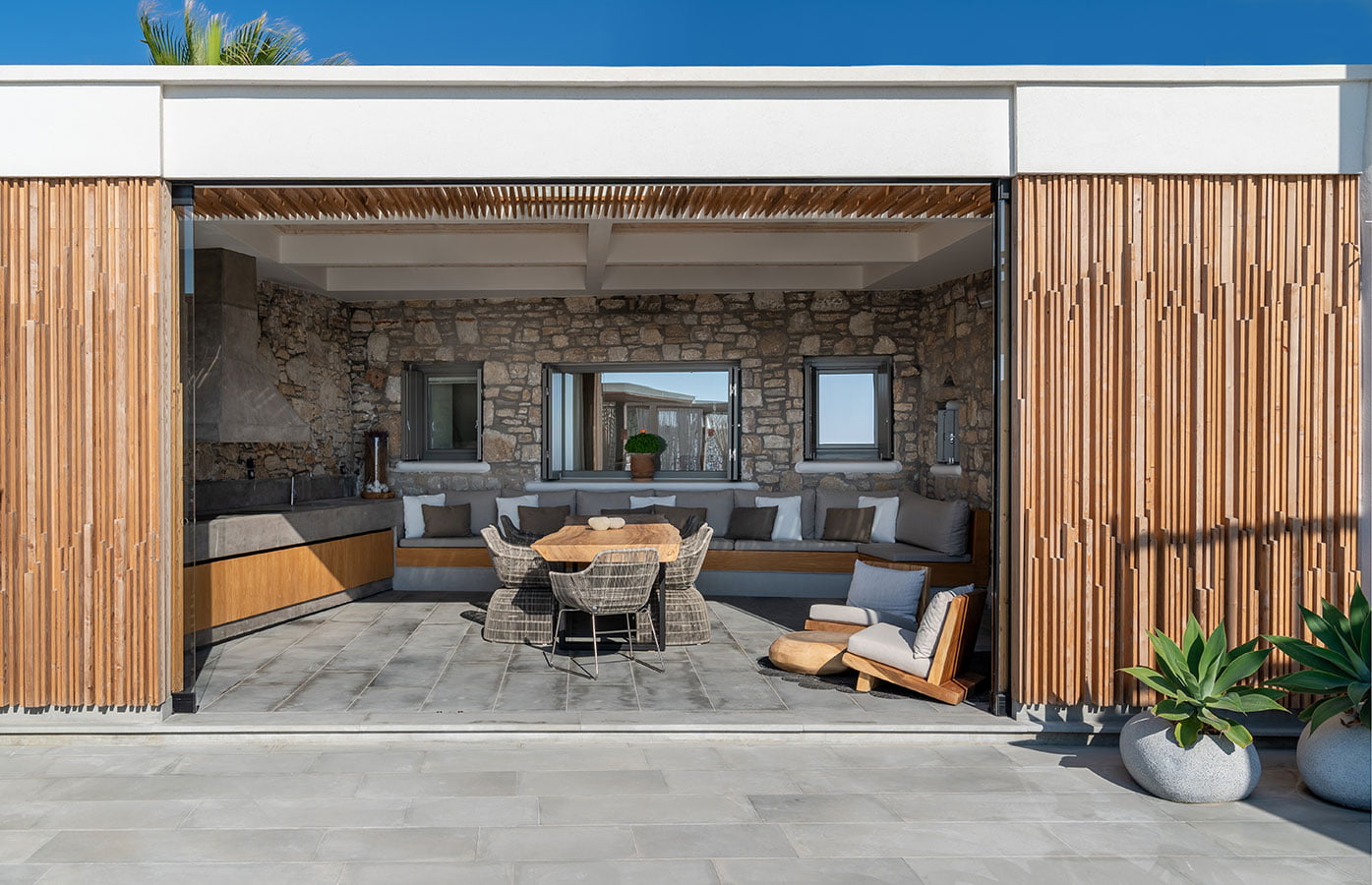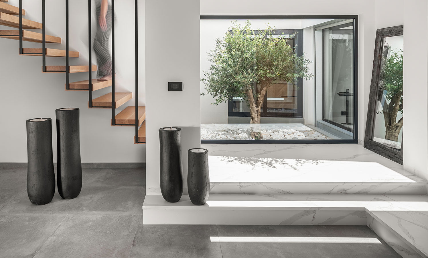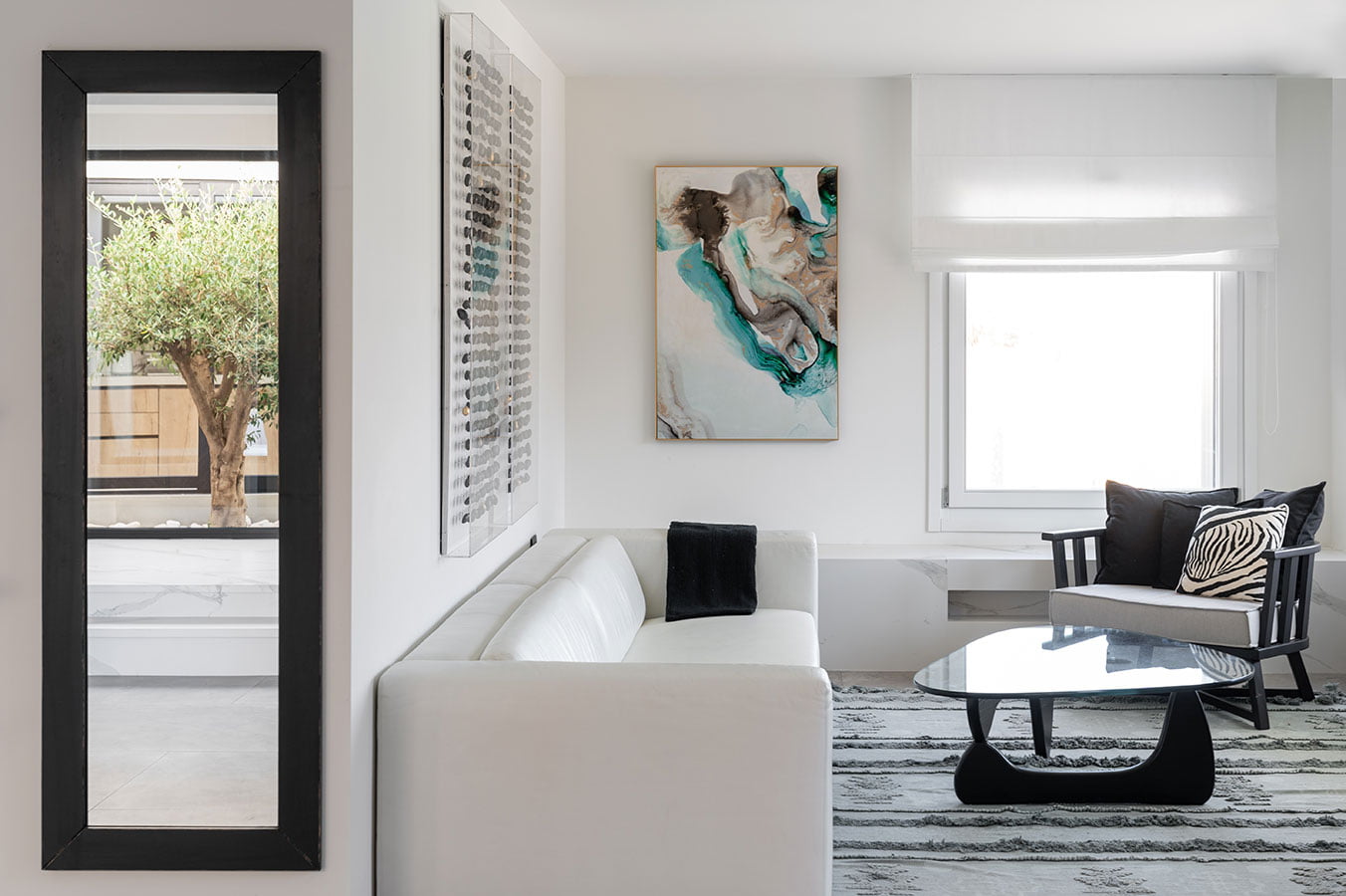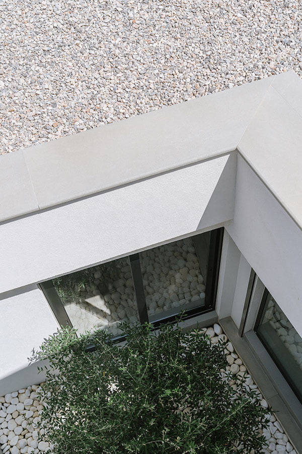 Βασική συνθετική αρχή είναι ο επανασχεδιασμός της κατοικίας έτσι ώστε οι χώροι να συνδεθούν με εσωτερικές κινήσεις, καθώς επίσης και η δημιουργία μιας μικρής εσωτερικής αυλής στην αρχική θέση της δεξαμενής συλλογής όμβριων υδάτων. Αυτό το μικρό αίθριο στον πυρήνα της σύνθεσης γίνεται σημείο αναφοράς της κατοικίας, ενώ διοχετεύει με φως το εσωτερικό των χώρων που διαρθρώνονται περιμετρικά του, αλλά προσφέρει και φυσικό εξαερισμό και δροσισμό σε αυτούς. Όσον αφορά την εσωτερική διαρρύθμιση, οι προτεινόμενοι χώροι έχουν αναφορές στην κυκλαδίτικη αρχιτεκτονική, η οποία εδώ αποδίδεται με σύγχρονες γραμμές. Οι τοίχοι καλύπτονται με λευκό χρώμα, ενώ τα δάπεδα με κεραμικά πλακίδια μεγάλων διαστάσεων σε ανοιχτό γκρι χρώμα. Ένα ακόμη βασικό υλικό είναι το ξύλο σε φυσική απόχρωση, που χρησιμοποιείται κυρίως σε custom κατασκευές επίπλων και επενδύσεις τοίχων.