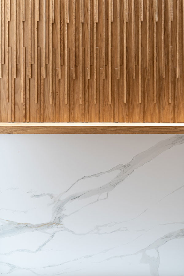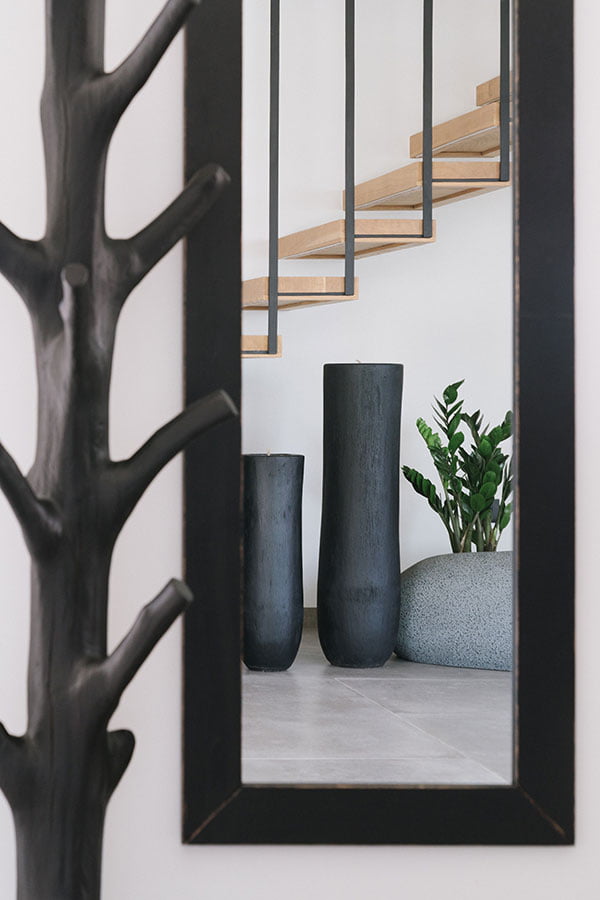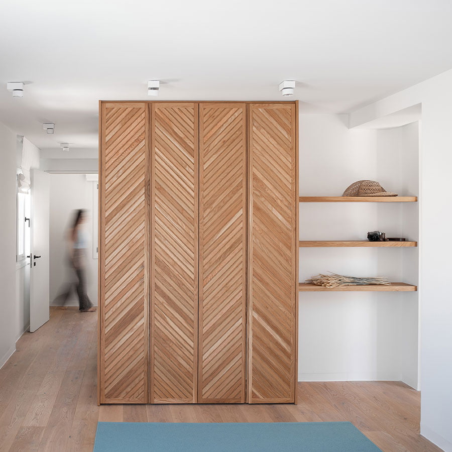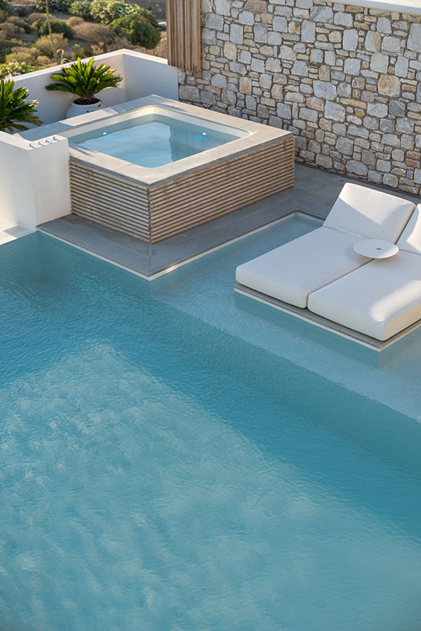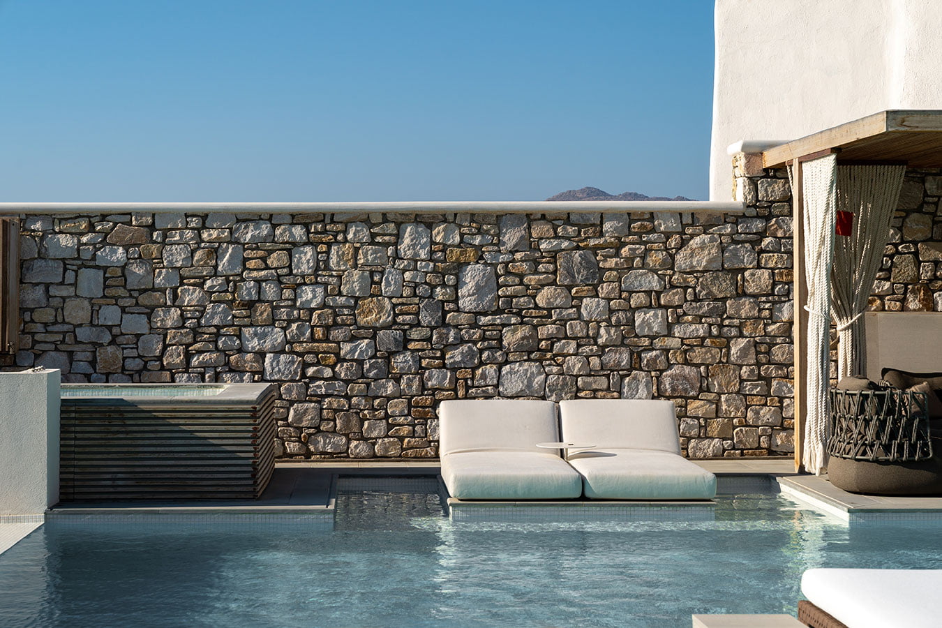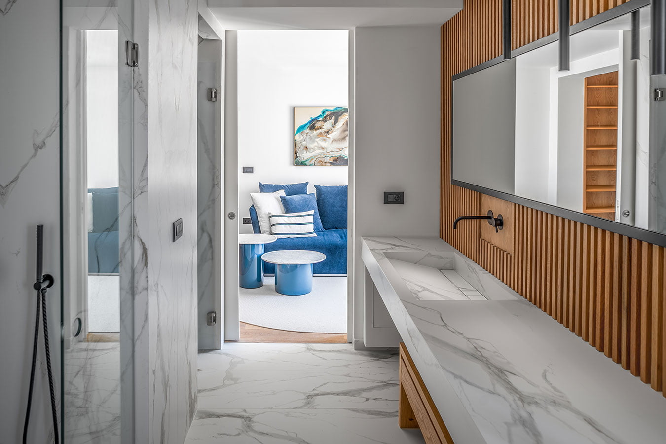 Βασική συνθετική αρχή είναι ο επανασχεδιασμός της κατοικίας έτσι ώστε οι χώροι να συνδεθούν με εσωτερικές κινήσεις, καθώς επίσης και η δημιουργία μιας μικρής εσωτερικής αυλής στην αρχική θέση της δεξαμενής συλλογής όμβριων υδάτων. Αυτό το μικρό αίθριο στον πυρήνα της σύνθεσης γίνεται σημείο αναφοράς της κατοικίας, ενώ διοχετεύει με φως το εσωτερικό των χώρων που διαρθρώνονται περιμετρικά του, αλλά προσφέρει και φυσικό εξαερισμό και δροσισμό σε αυτούς. Όσον αφορά την εσωτερική διαρρύθμιση, οι προτεινόμενοι χώροι έχουν αναφορές στην κυκλαδίτικη αρχιτεκτονική, η οποία εδώ αποδίδεται με σύγχρονες γραμμές. Οι τοίχοι καλύπτονται με λευκό χρώμα, ενώ τα δάπεδα με κεραμικά πλακίδια μεγάλων διαστάσεων σε ανοιχτό γκρι χρώμα. Ένα ακόμη βασικό υλικό είναι το ξύλο σε φυσική απόχρωση, που χρησιμοποιείται κυρίως σε custom κατασκευές επίπλων και επενδύσεις τοίχων.