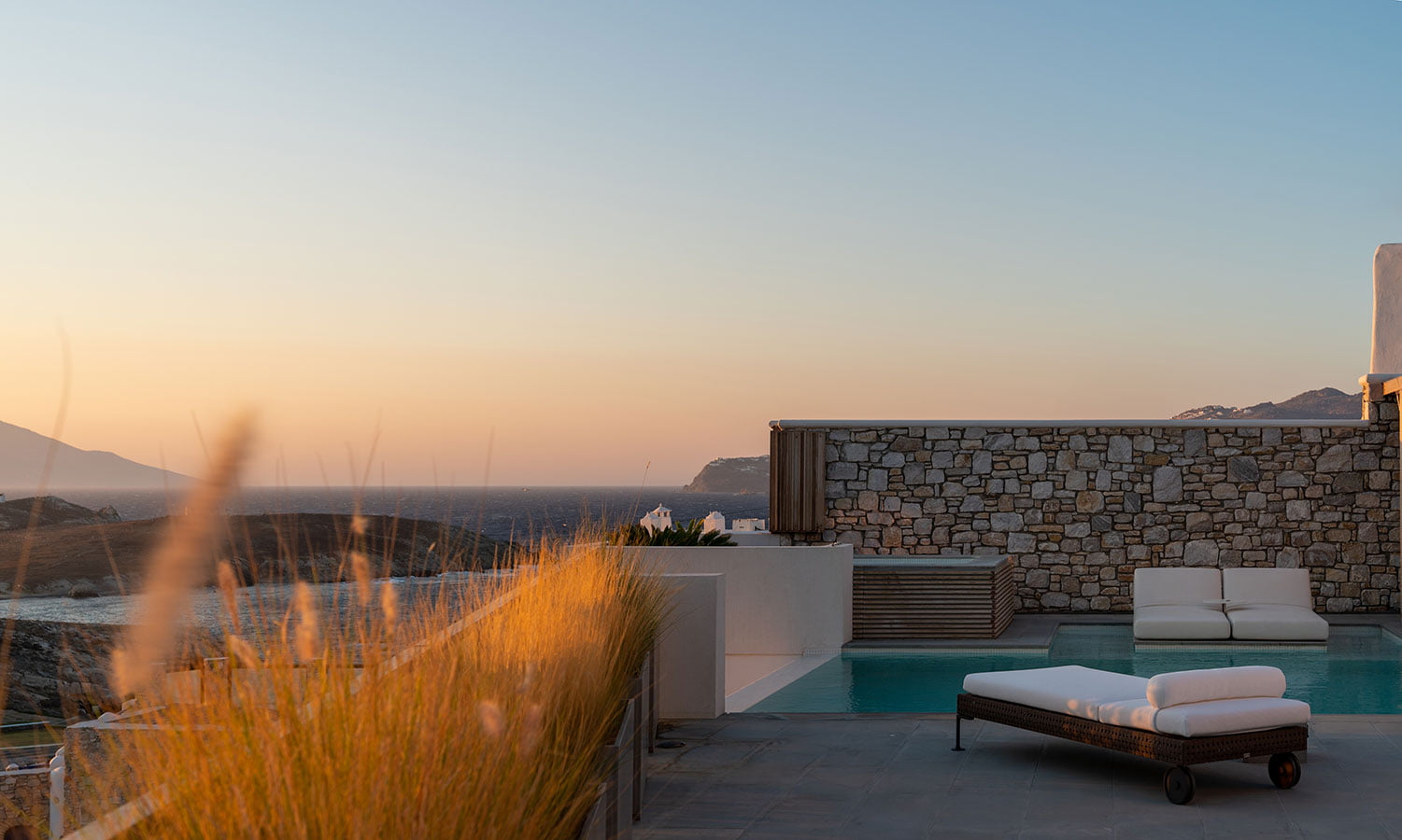 Η κατοικία αποτελείται από κοινόχρηστους χώρους διημέρευσης και τρία υπνοδωμάτια master bedrooms με en suite λουτρό στο ισόγειο, ενώ στον όροφο βρίσκεται ένα ανεξάρτητο studio με καθιστικό, υπνοδωμάτιο και λουτρό, που συνδέεται με την κύρια κατοικία μέσω εσωτερικής κλίμακας. Οι κοινόχρηστοι χώροι διημέρευσης περιλαμβάνουν χώρο καθιστικού, κουζίνα και τραπεζαρία που βρίσκονται σε άμεση επαφή με το αίθριο και φωτίζονται από αυτό, ενώ σε συνέχεια αυτών βρίσκεται ημιυπαίθριος χώρος bbq και τραπεζαρίας, με θέα προς την πισίνα και το pool bar.