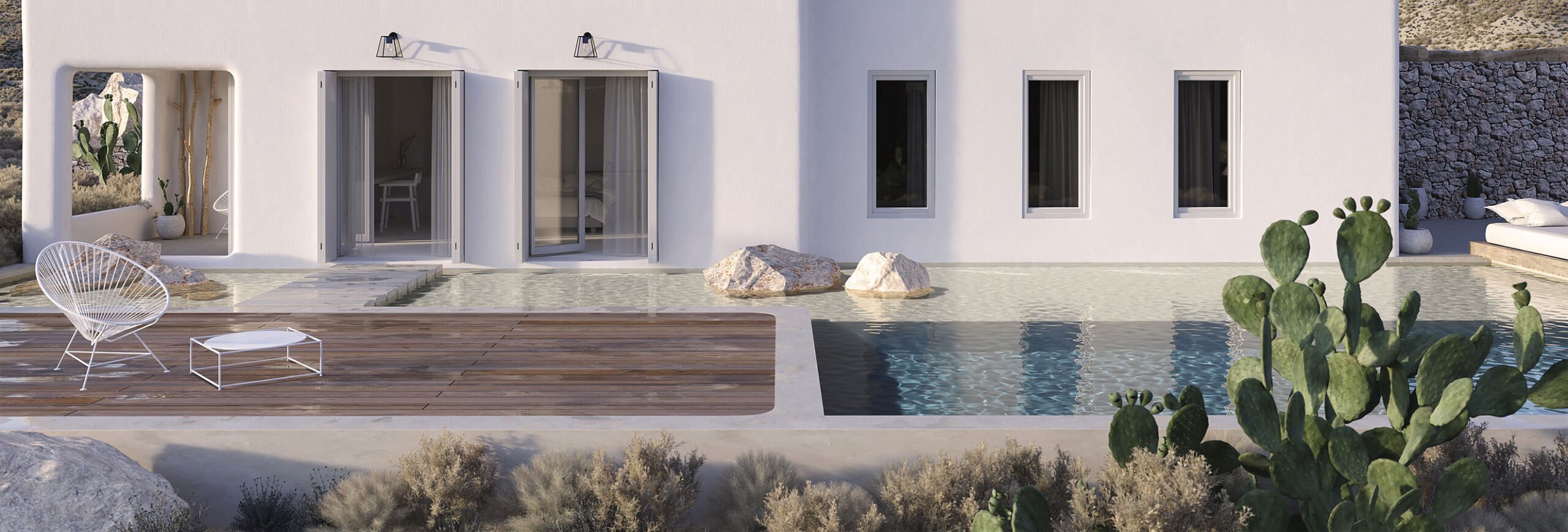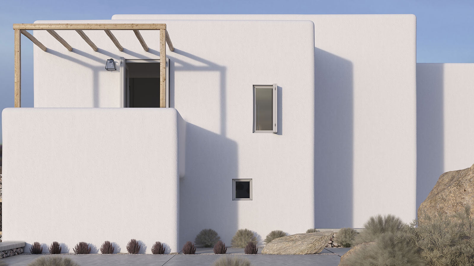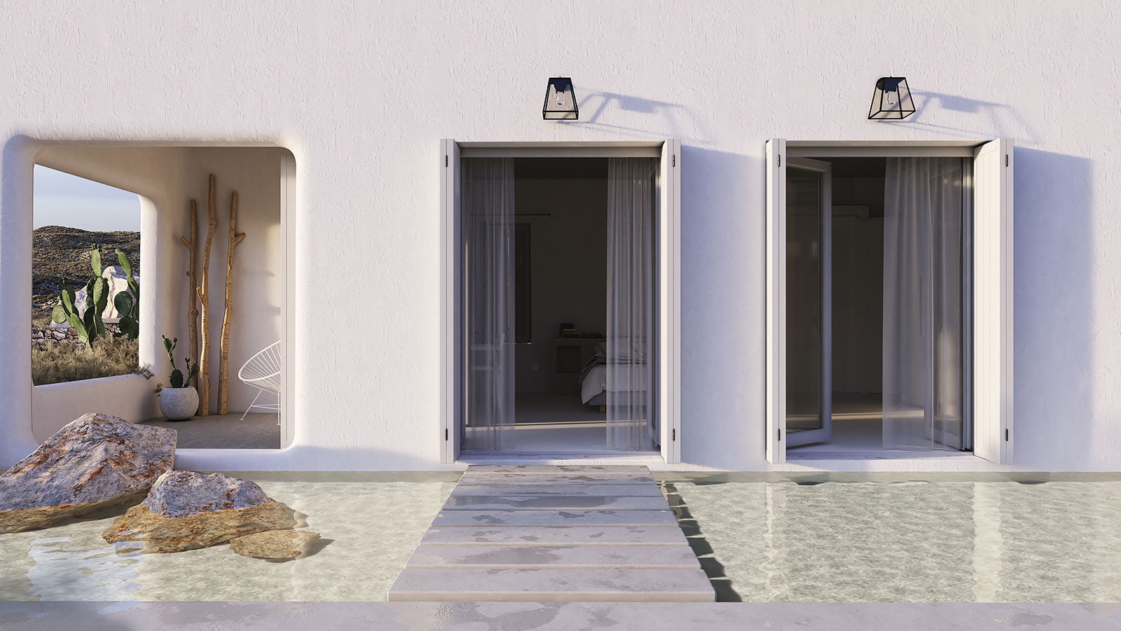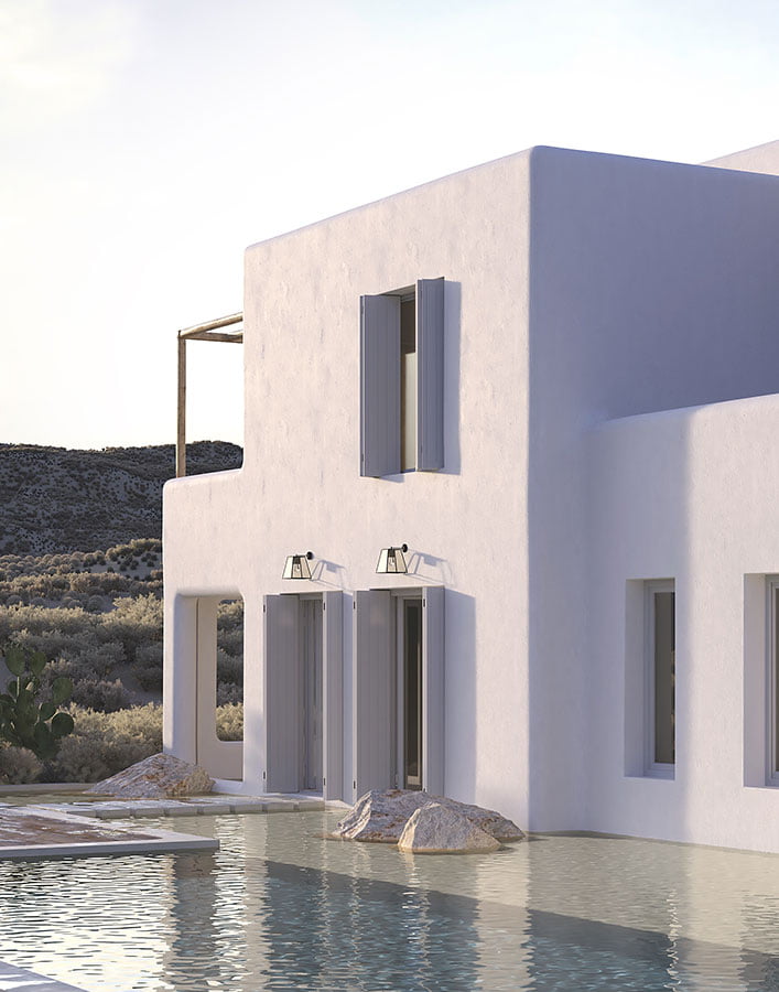A central element of the composition is the installation of a large surface of water, part of which functions as a swimming pool, along the main facade. The goal of this gesture is the visual integration of the swimming pool with the beach of Platis Gialos.