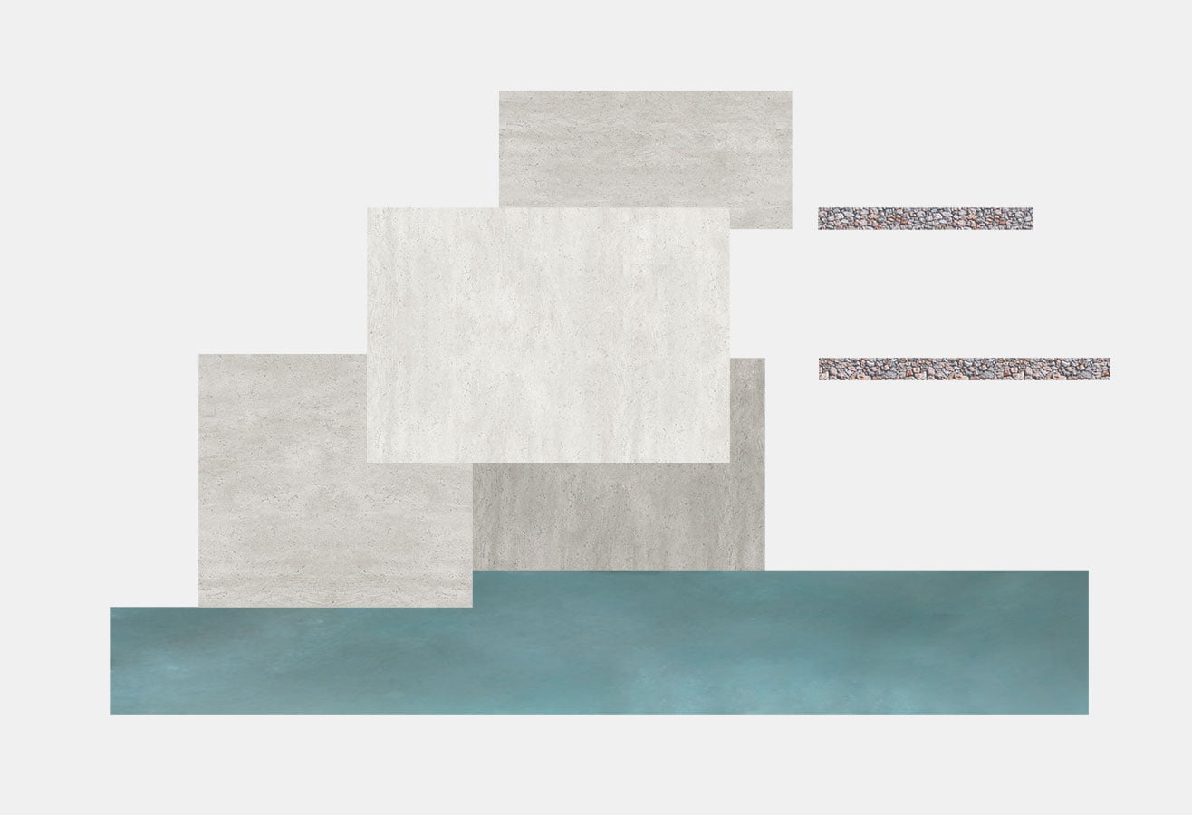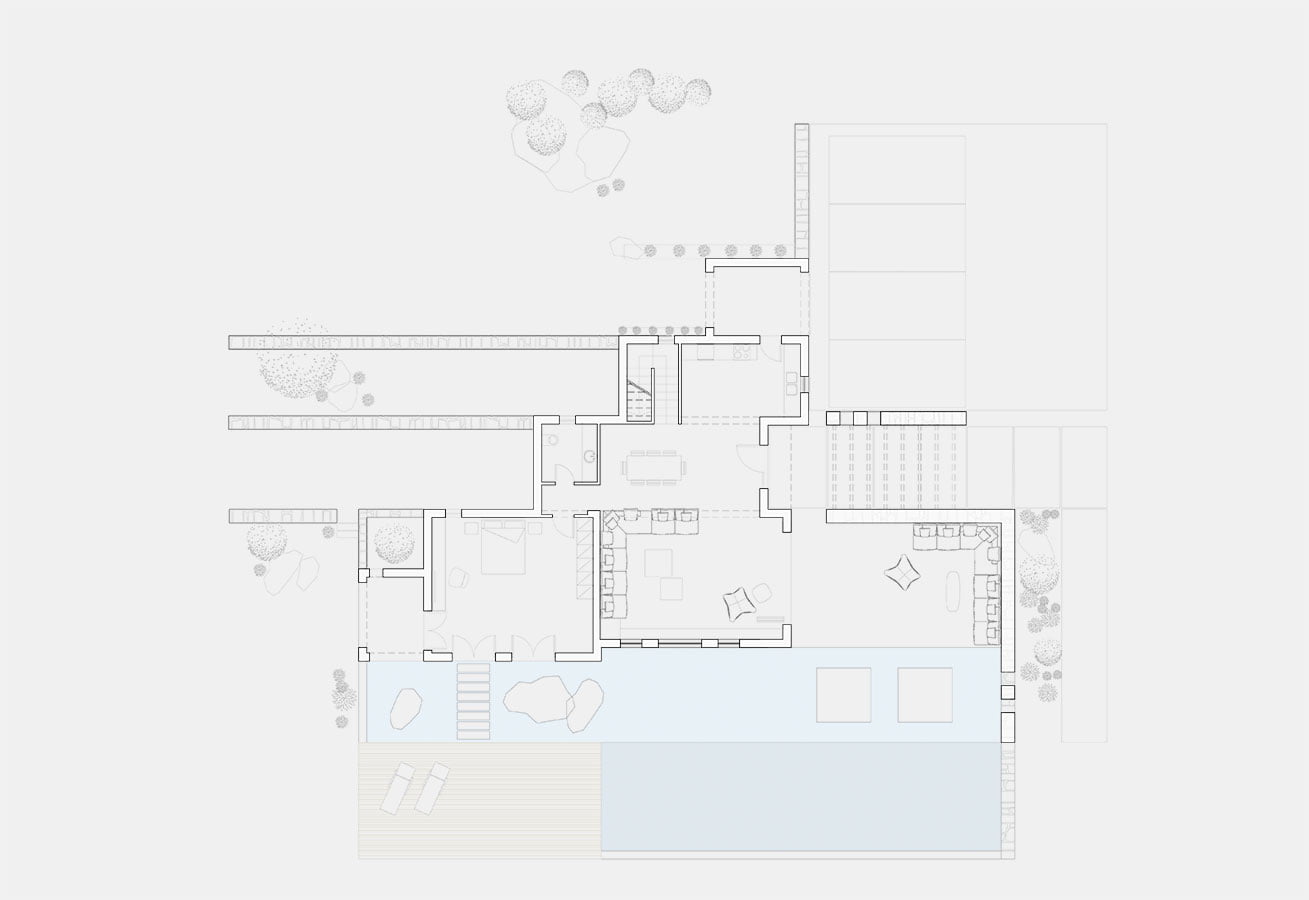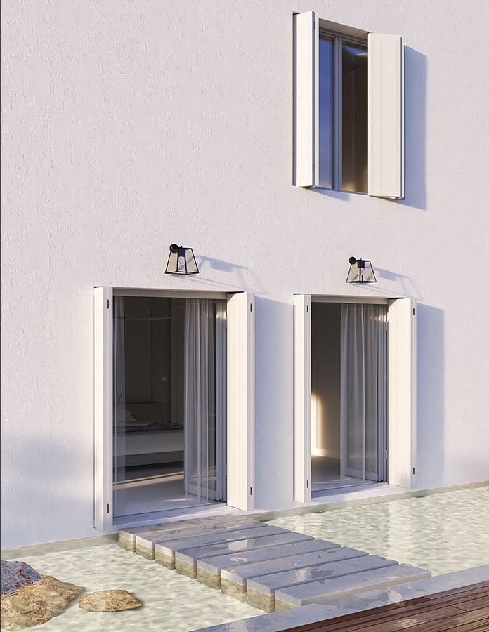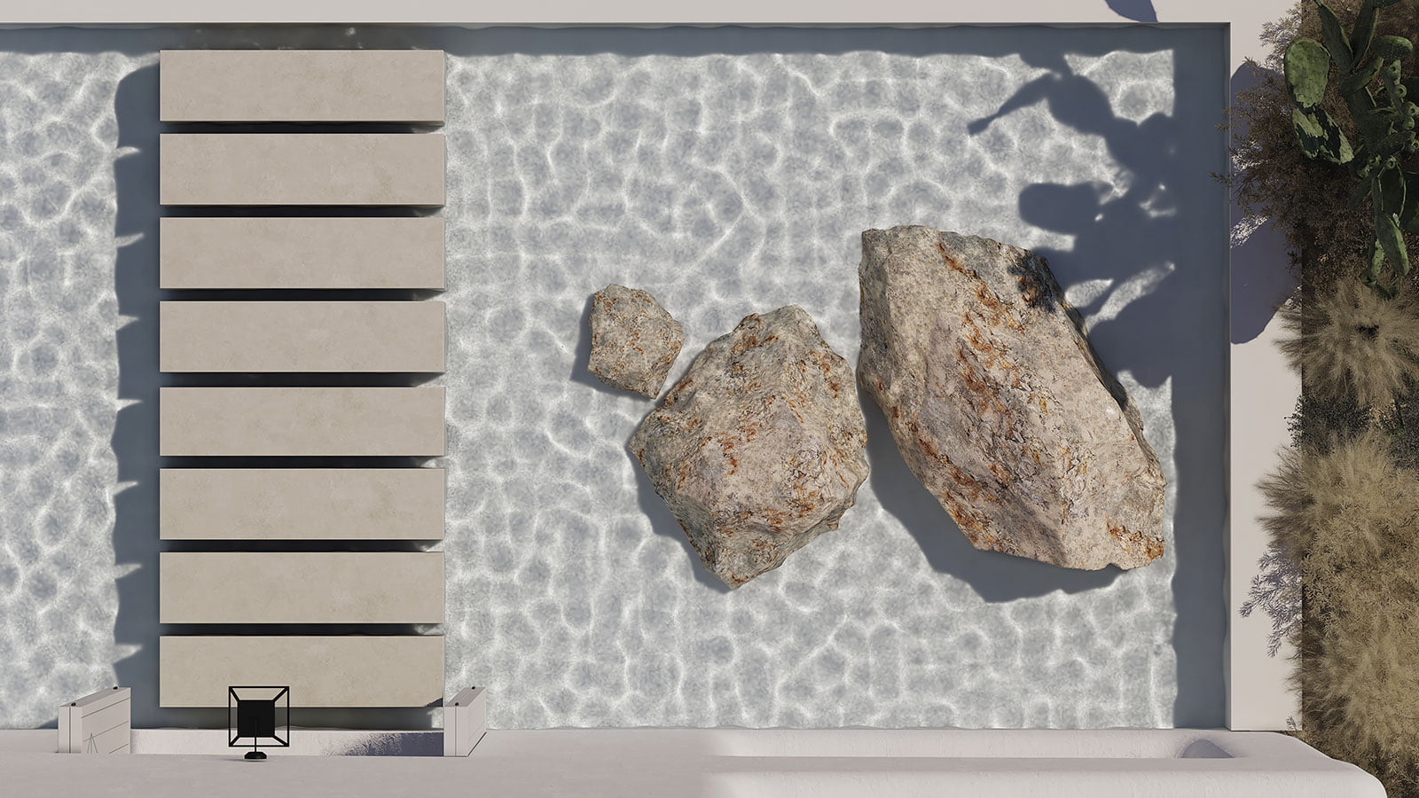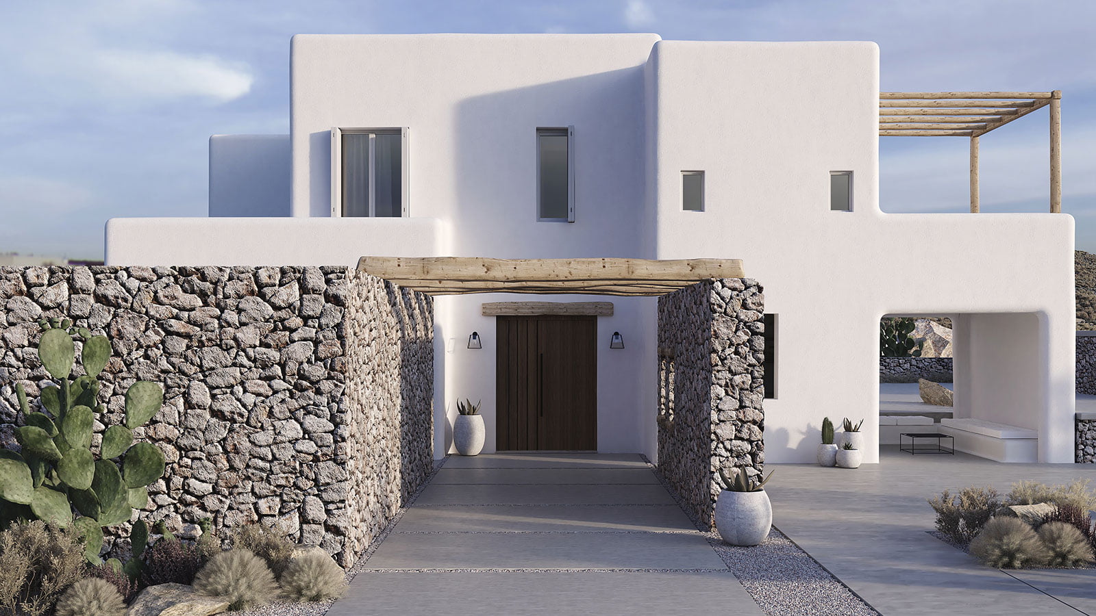 A central element of the composition is the installation of a large surface of water, part of which functions as a swimming pool, along the main facade. The goal of this gesture is the visual integration of the swimming pool with the beach of Platis Gialos.