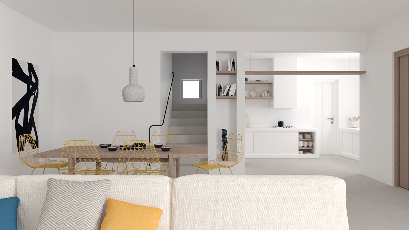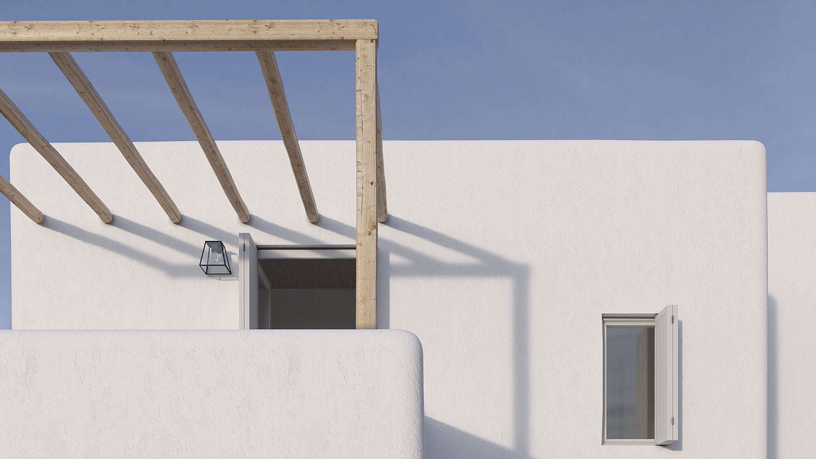 As far as the interior layout is concerned, the proposed spaces have references to the Cycladic architecture, which is given with modern lines. The walls are covered with white plaster and the floors with cement in light gray. Most of the furniture is built and overlaid with white plaster, as is customary in Cycladic residences.