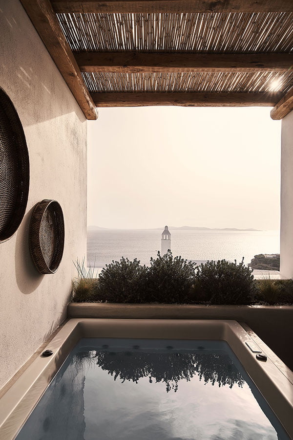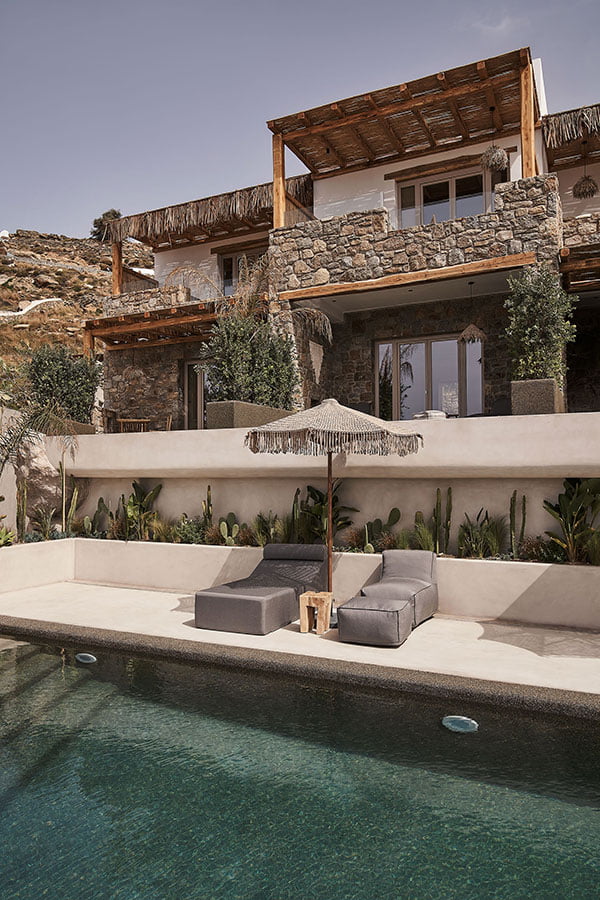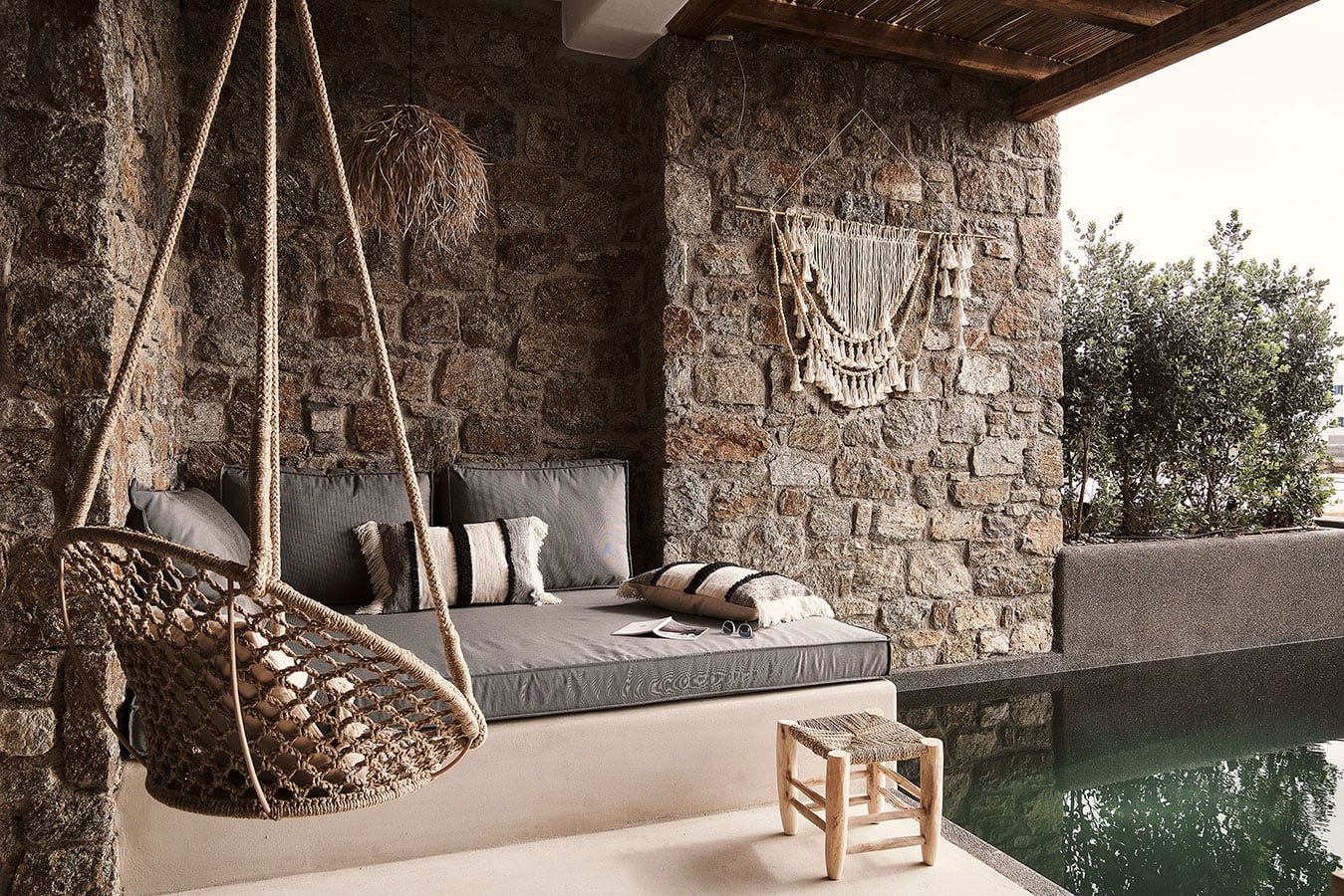 The biggest challenge out team had to face while developing this project of 5* modern hotel unit was dealing with the plot’s shape and geomorphology. On the outskirts of Agios Stefanos settlement in Mykonos, two distinct plot areas connect through a long and narrow piece of land. Being exactly on the boundaries of the settlement, our study had to face these restrictions and turn them into challenging guidelines of the design.