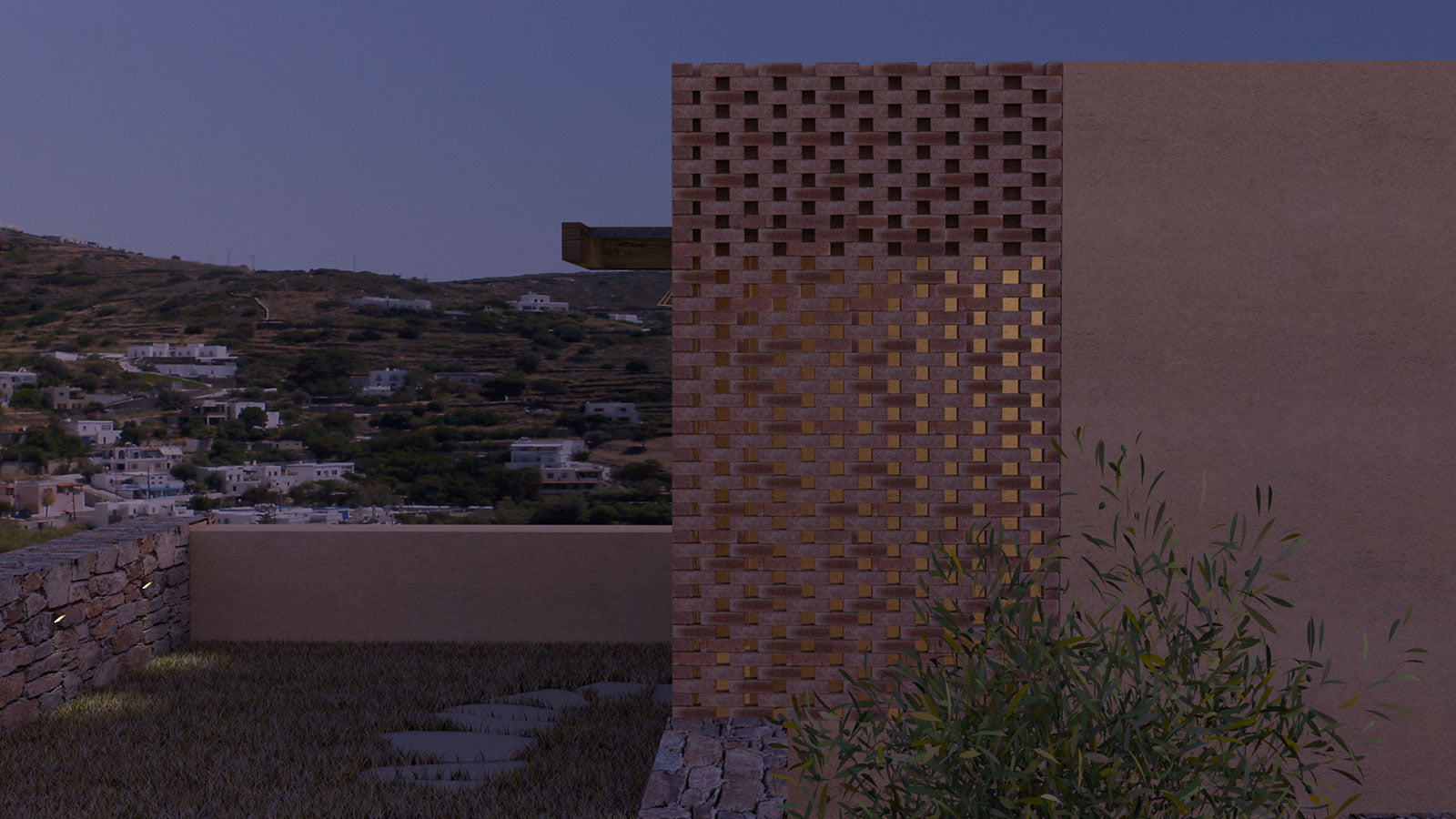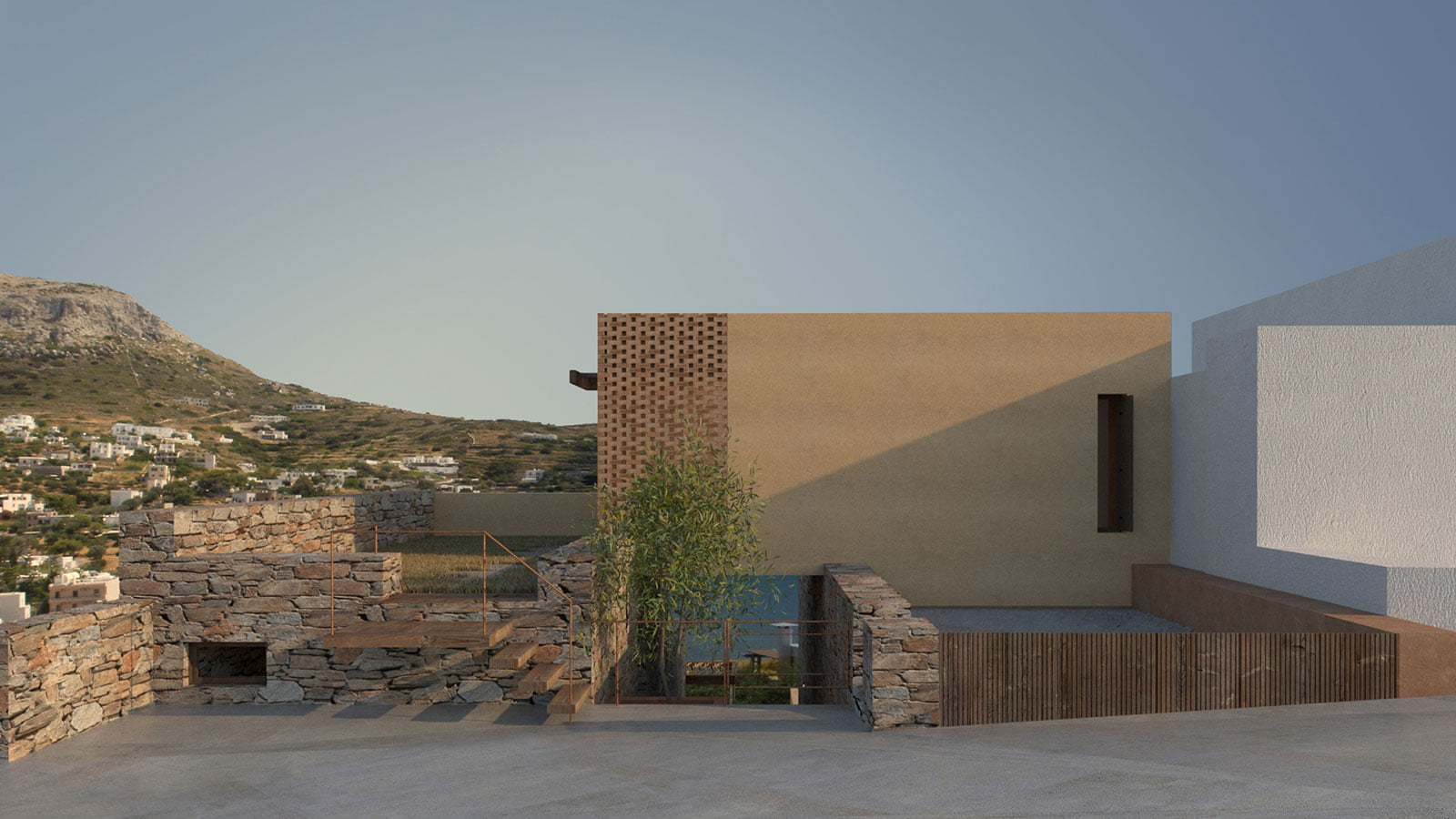 The proposed materials derive their origins by the special characteristics of Syros’ landscape, both natural and manmade. The main construction material would be the local natural stone and wood. On the building volumes’ façades, colored plaster is used for the better integration with the palette of Ano Syros, while panels of solid red brick follow the claustra’s construction technique and create an interesting play between light and shadow.