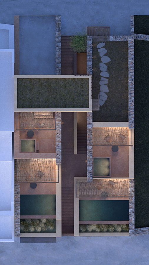 This little complex consists of 4 residences of about 25s.q. that can be accessed independently, two of which are located on the first level and have a private pool, while the rest two have a jacuzzi. The main promenade is formed to give access from both public roads, on the north and the south boundary of the plot. Except from giving access to all private residences, it also defines framed views of the settlement and the beach while accessing them.