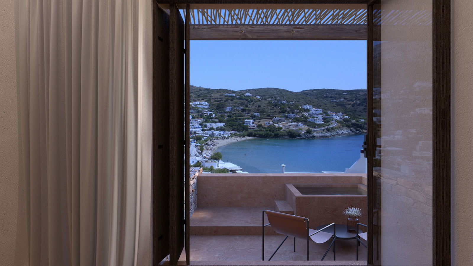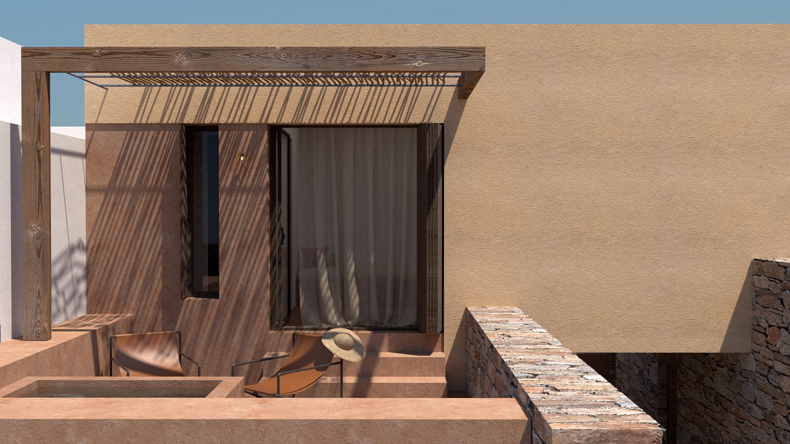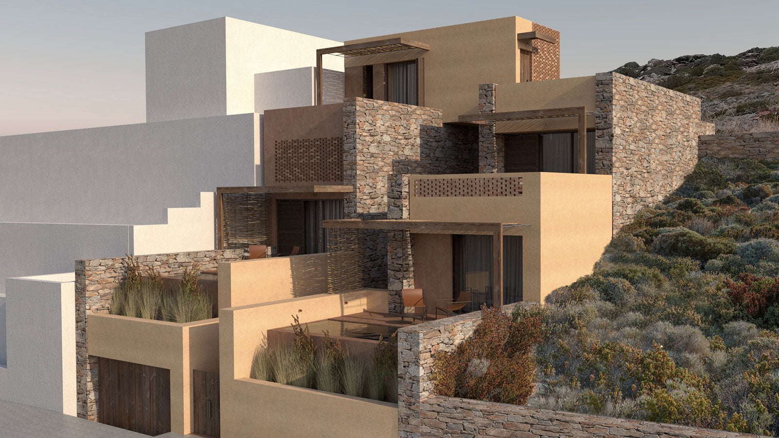 A key objective of this study is the creation of unified interior and exterior spaces, that is achieved by wide framings ensuring adequate lighting and nullifying any boundary between interior and exterior. The wooden shading constructions with natural reed covering create the necessary shading and offer privacy to the residences’ outdoor private areas.