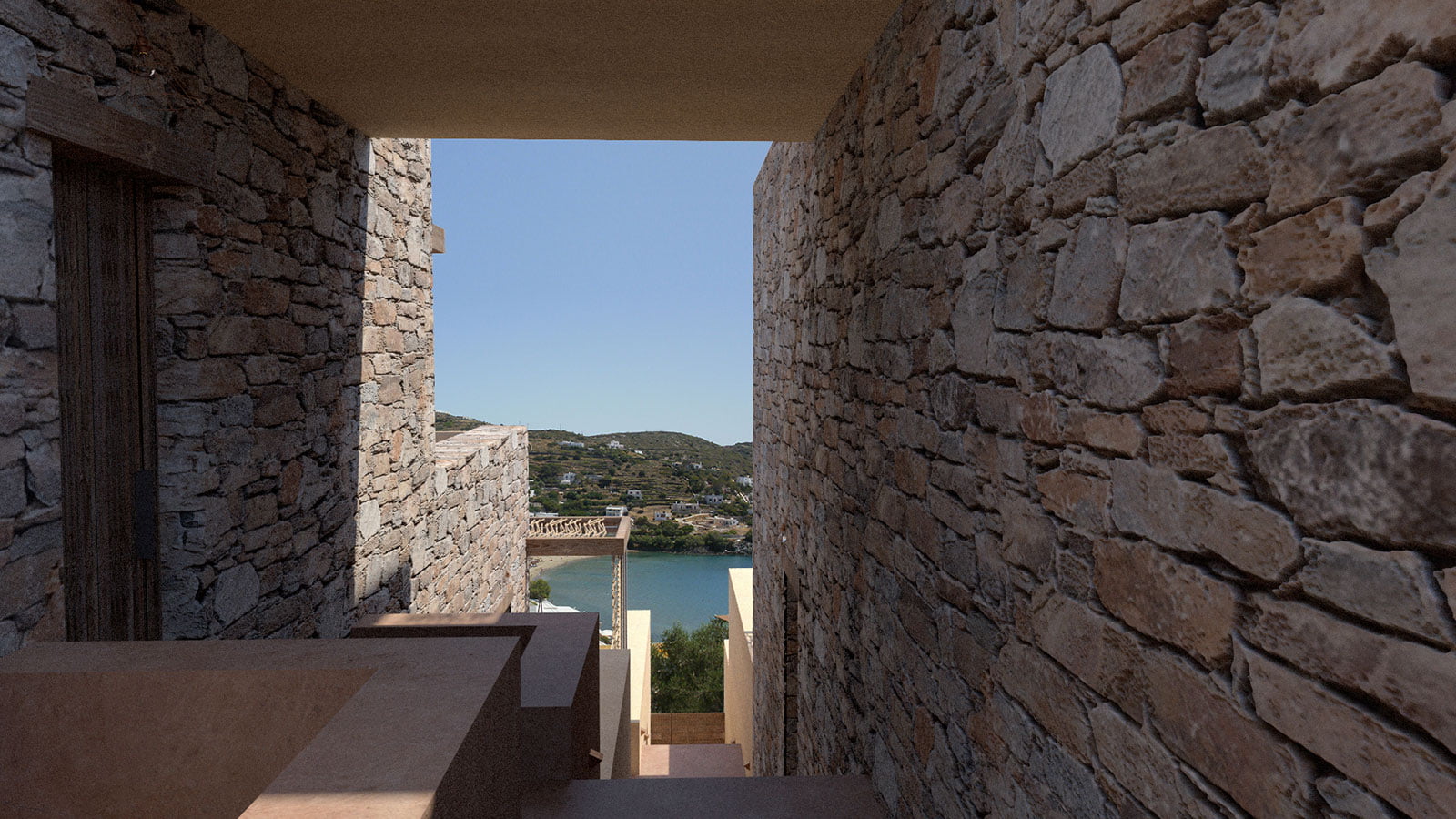 Driven by the intense slope of the plot’s natural terrain and with respect to the landscape, the complex is developing in different levels, so that all private residential areas, as well as the private outdoor areas, have unobstructed view to the Kini gulf. Main identifying element of the synthesis is the horizontal longitudinal and permeable promenade, that had a key role at the volumes’ formation.