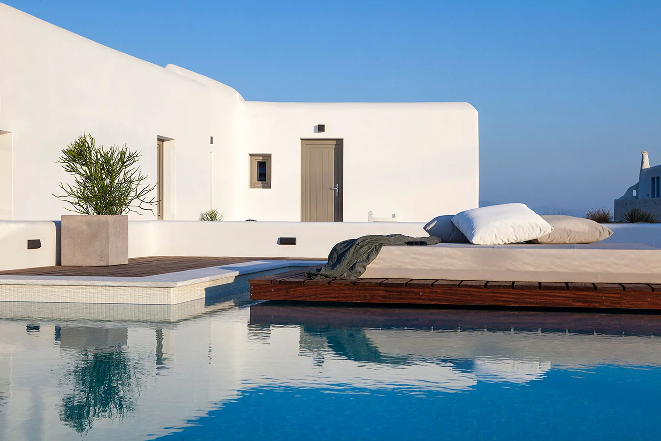 As the central core and reference of the complex, an outdoor space of public programs is created, where the main pool is located. Following an introversive structure with framed views to the sea, this public space is located in the centre of the complex, allowing private spaces to unobstructed views to the sea. Both water and planting of the surrounding area contribute to the creation of an ideal microclimate.