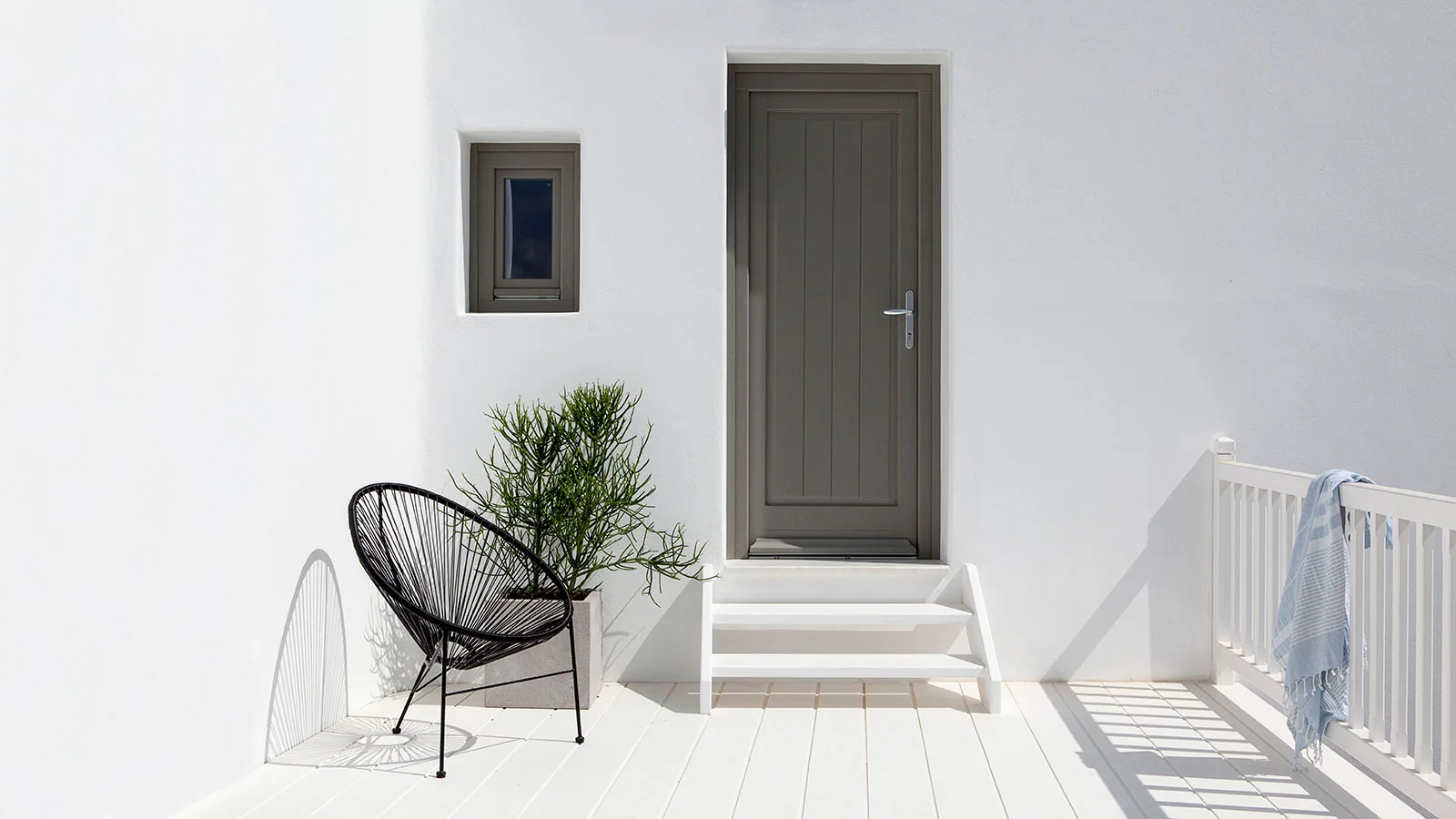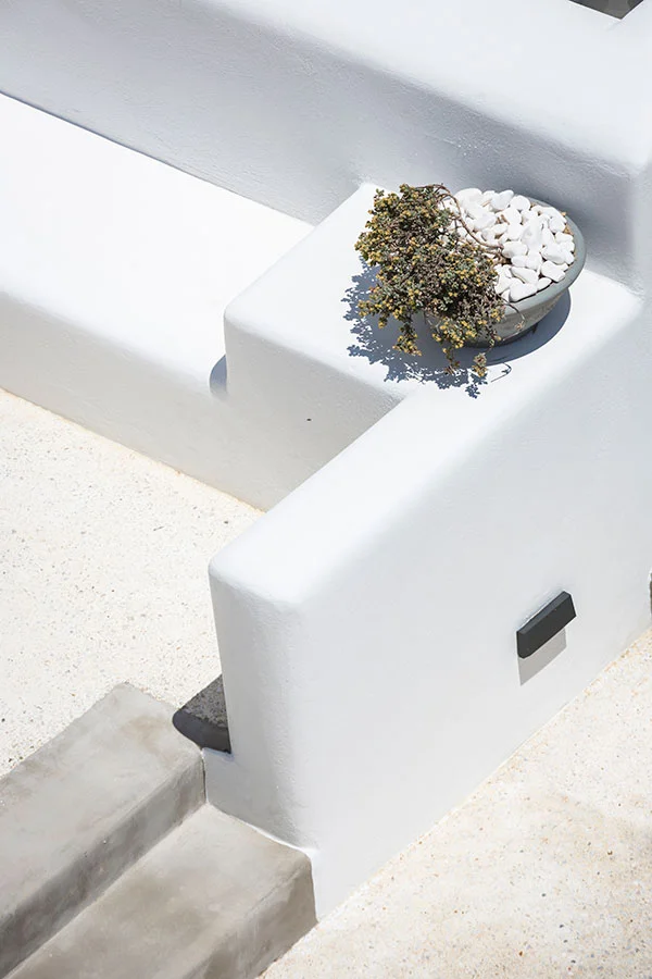 The materials used include local stone, plaster and wood at the landscaping, while on the buildings’ façade new wooden framings are placed and rough white plaster is used, aiming to emerge the building volumes under the bright Cycladic light.