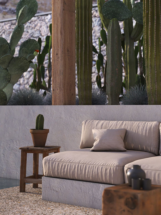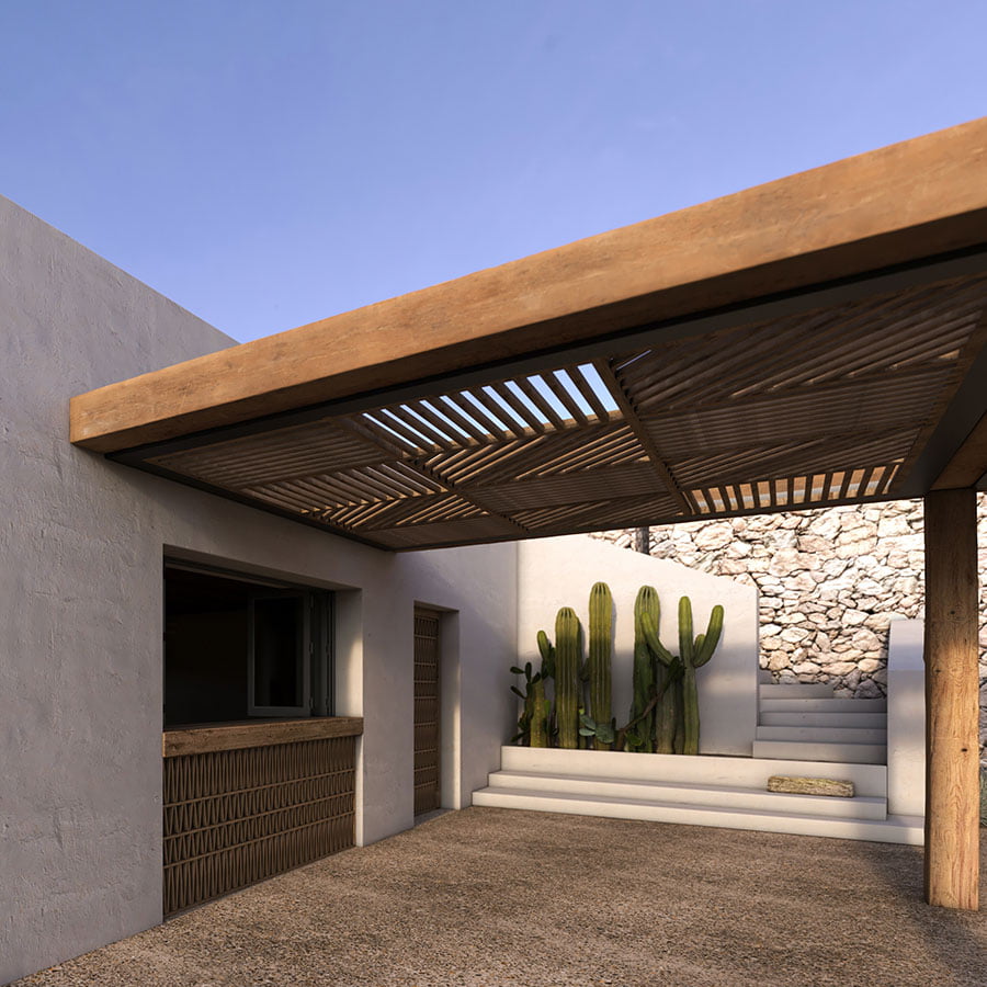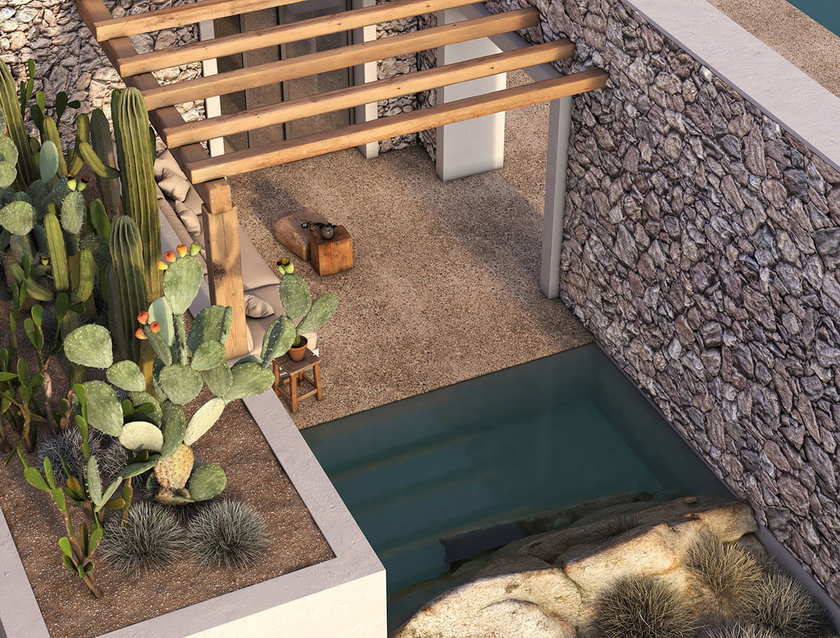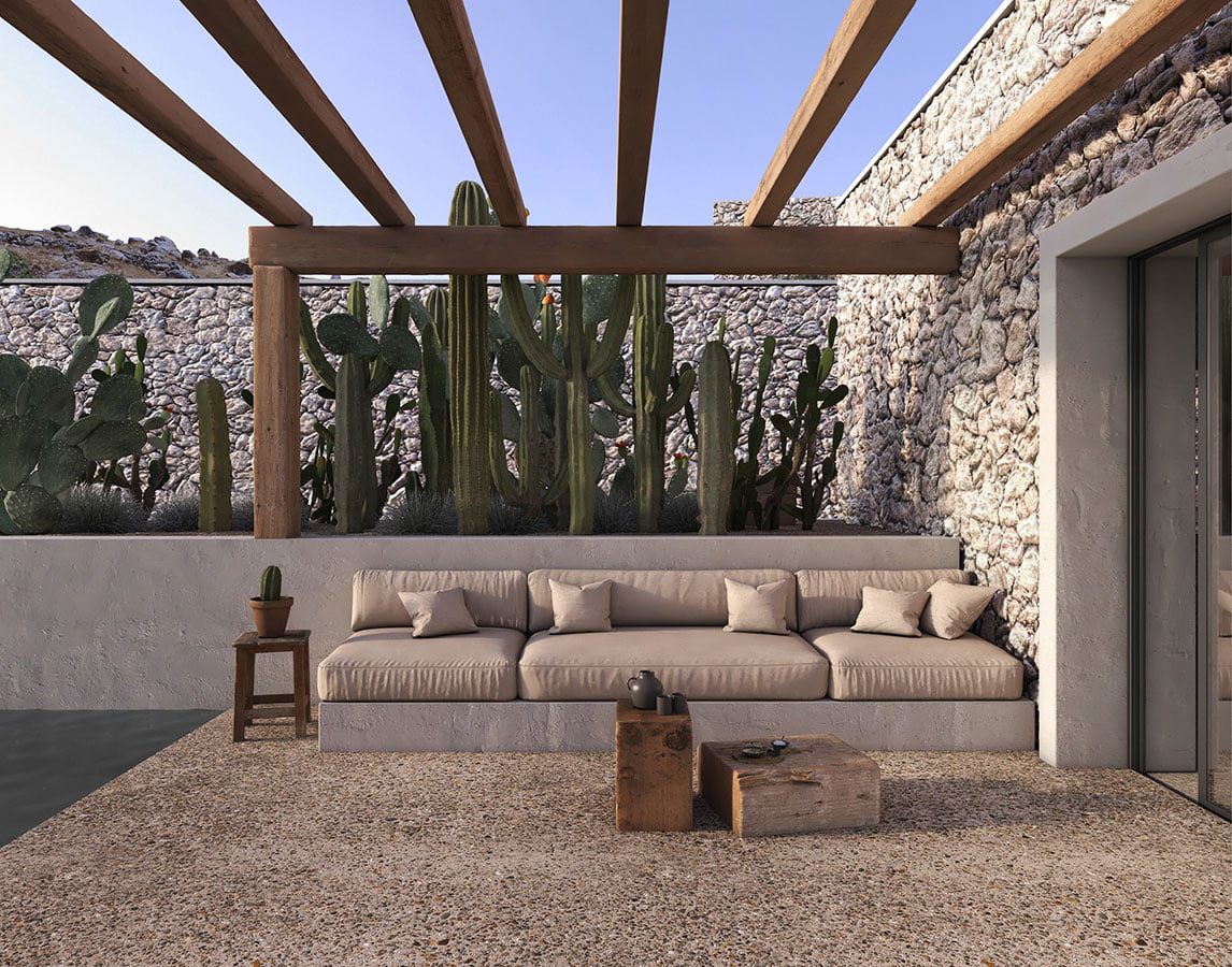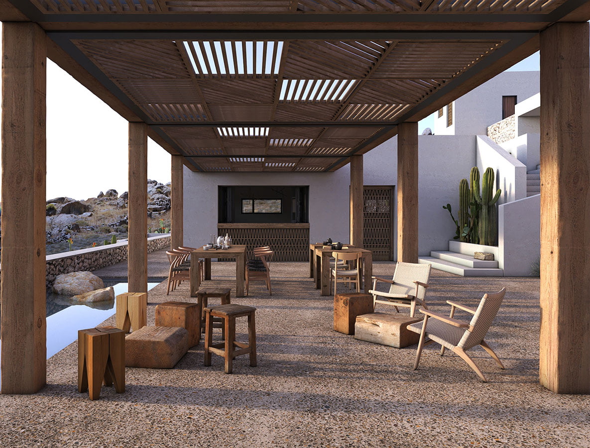 The entrance is located to the south part of the plot, where two building volumes are attached to the stonewall, hosting the main public uses; the reception and lounge area, as well as the hotel’s restaurant. The outdoor dining area is situated between the two building volumes, under a wooden pergola and interacting with the swimming pool.