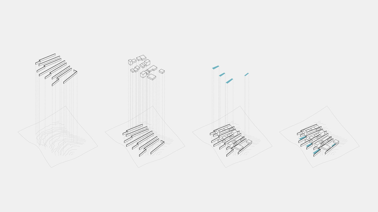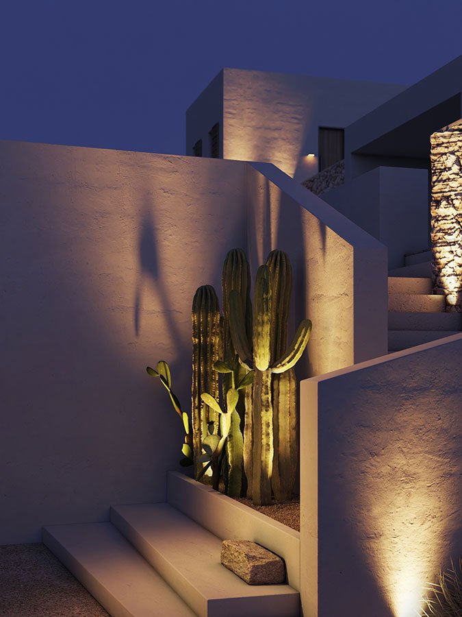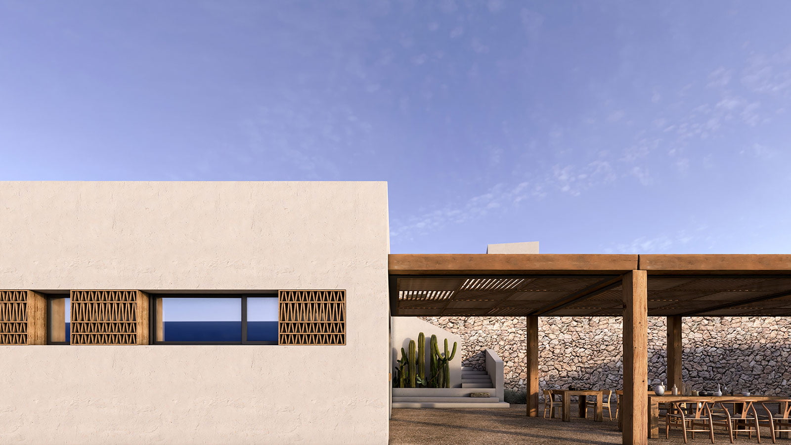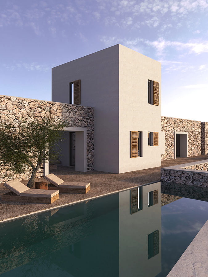 Crossing the reception and dining area heading north, three elongated building volumes formed in different levels host all rooms and suites with unobstructed sea views. Each residential unit disposes of a private outdoor area and access to a private pool or a jacuzzi. Most rooms are located on the ground floor, while the suites are placed on the upper level.