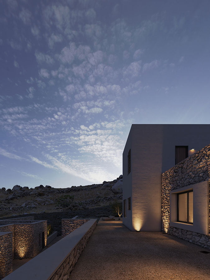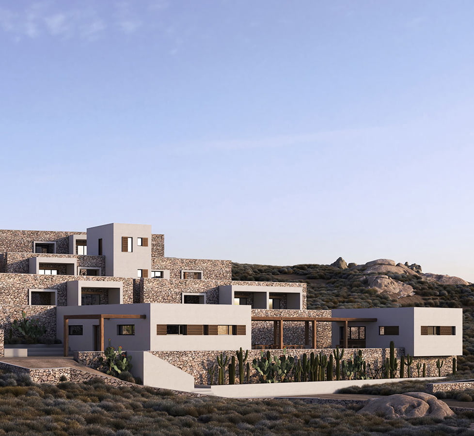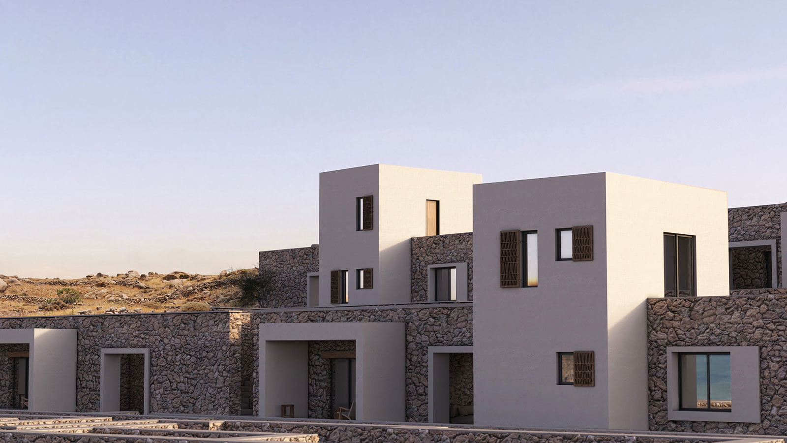 The PNLP Hotel project concerns a hotel complex in Kalo Livadi, Mykonos, with the capacity of 42 beds. All building volumes are divided in four elongated building zones. Stonewalls organize the natural terrain and create platforms on it, so that the white-plastered building volumes either attach or penetrate such elements, creating an interesting interaction between the two dominant materials.