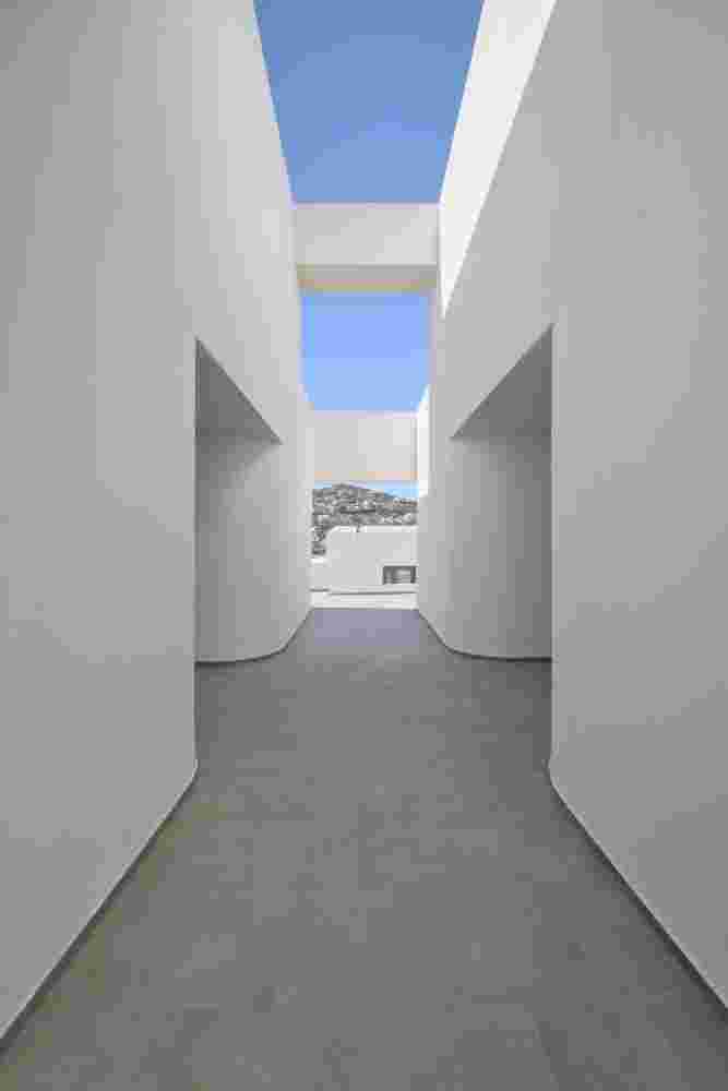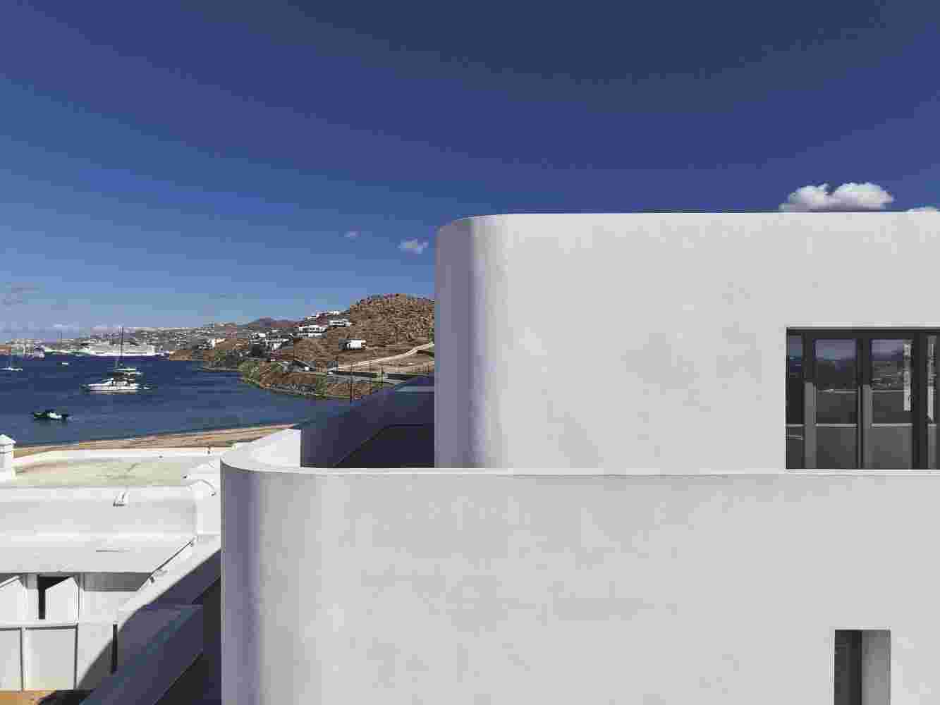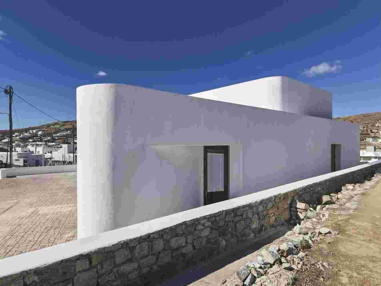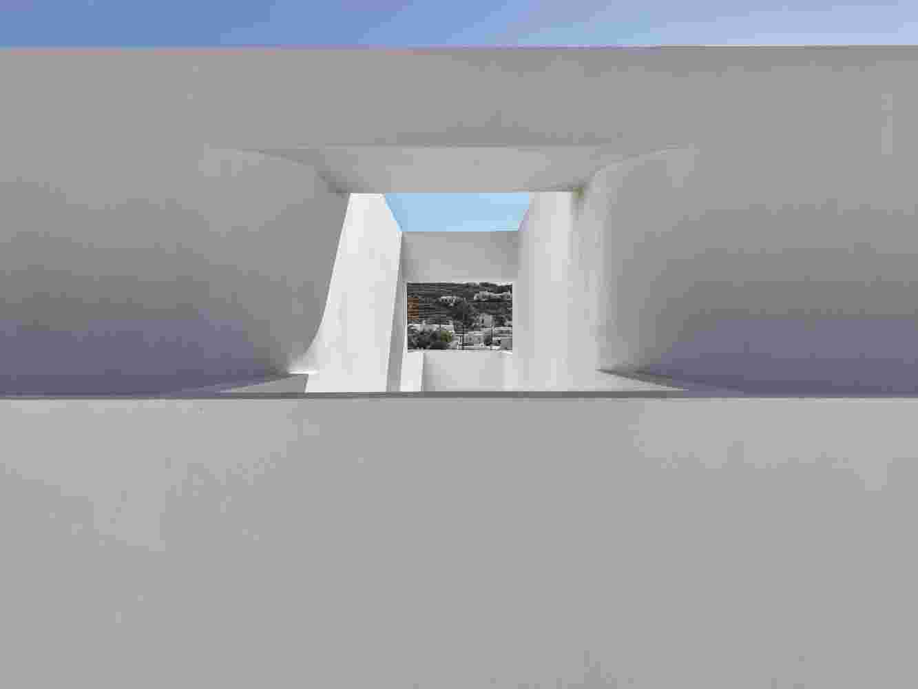 The form of the building is perceived as a unified volume with gentle curvatures, directly referencing the vernacular architecture of Mykonos. The curved recesses of the façade and the shifting patterns of shade enhance the building’s dynamic relationship with light and time, highlighting its role as a contemporary landmark within the settlement of Ornos.