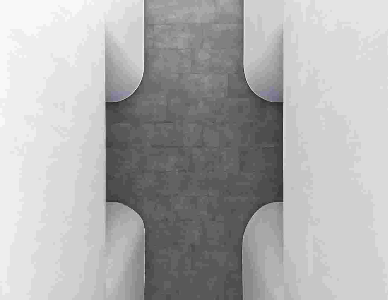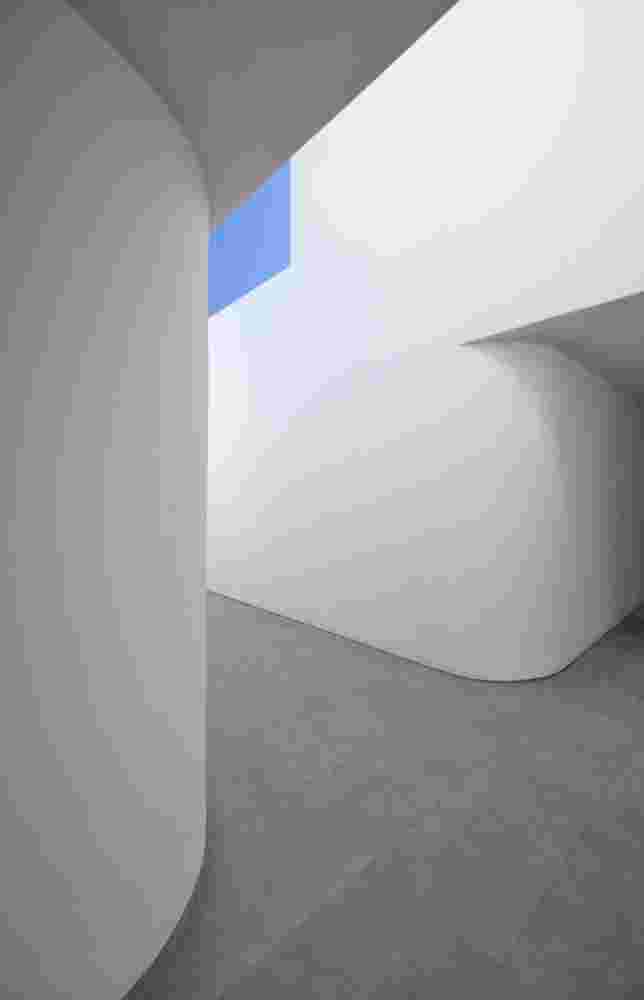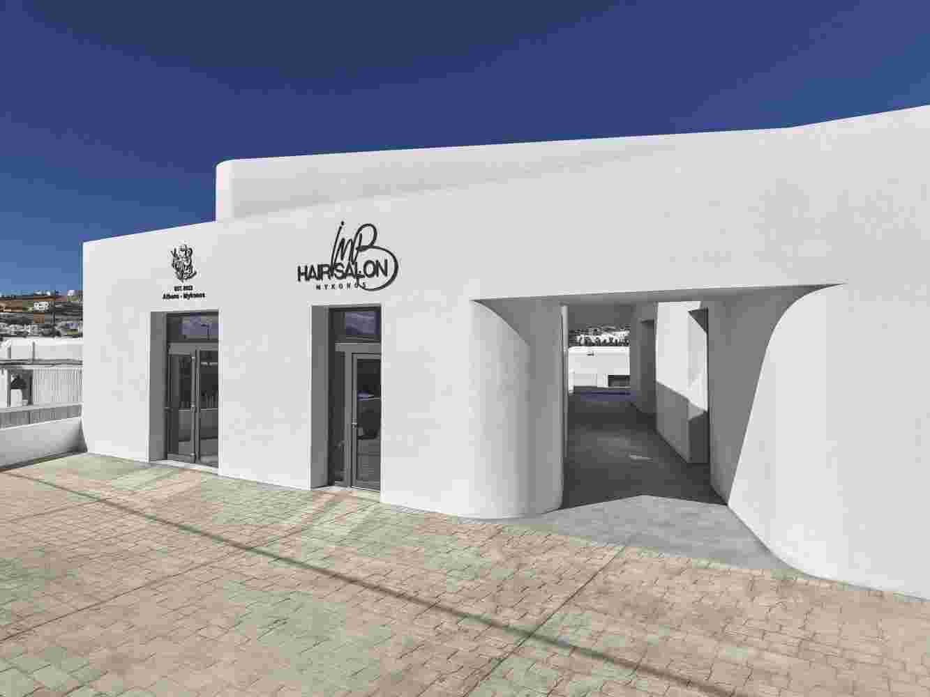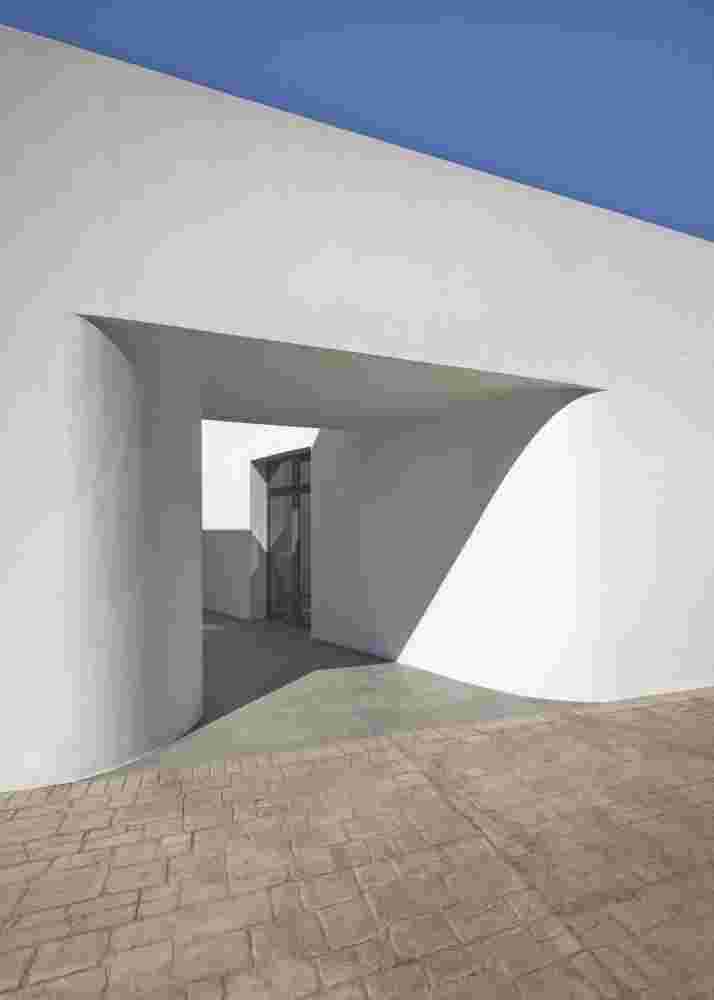 The form of the building is perceived as a unified volume with gentle curvatures, directly referencing the vernacular architecture of Mykonos. The curved recesses of the façade and the shifting patterns of shade enhance the building’s dynamic relationship with light and time, highlighting its role as a contemporary landmark within the settlement of Ornos.