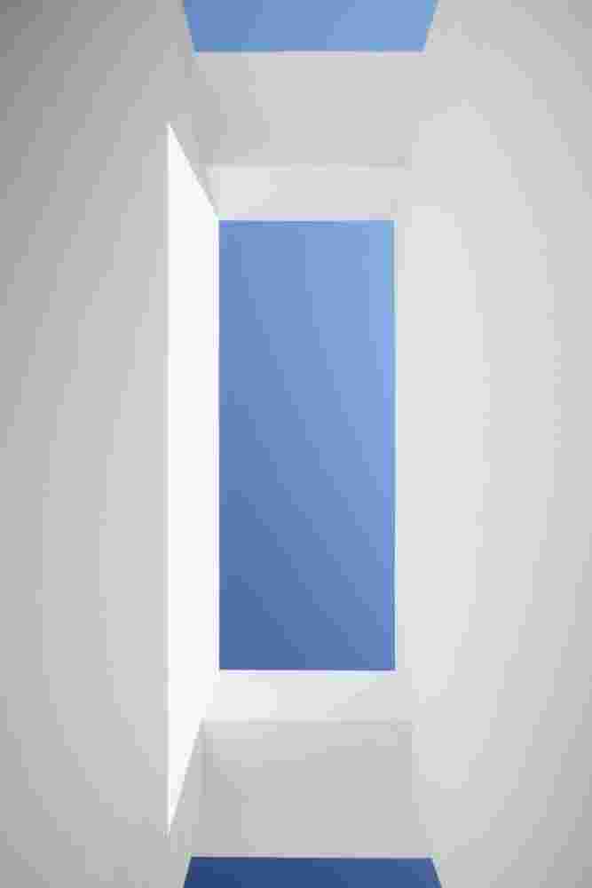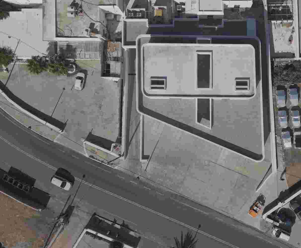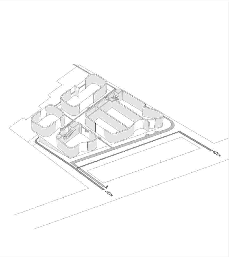 The building is developed on two levels. The ground floor remains open and accessible, allowing visual continuity and fluid circulation. The vertical axis–corridor is emphasized through the absence of a roof, a gesture that unifies the spaces and reveals the compositional structure of the building. The upper level hosts two independent units with direct access to outdoor terraces and visual connection to the ground floor through the open-air corridor.