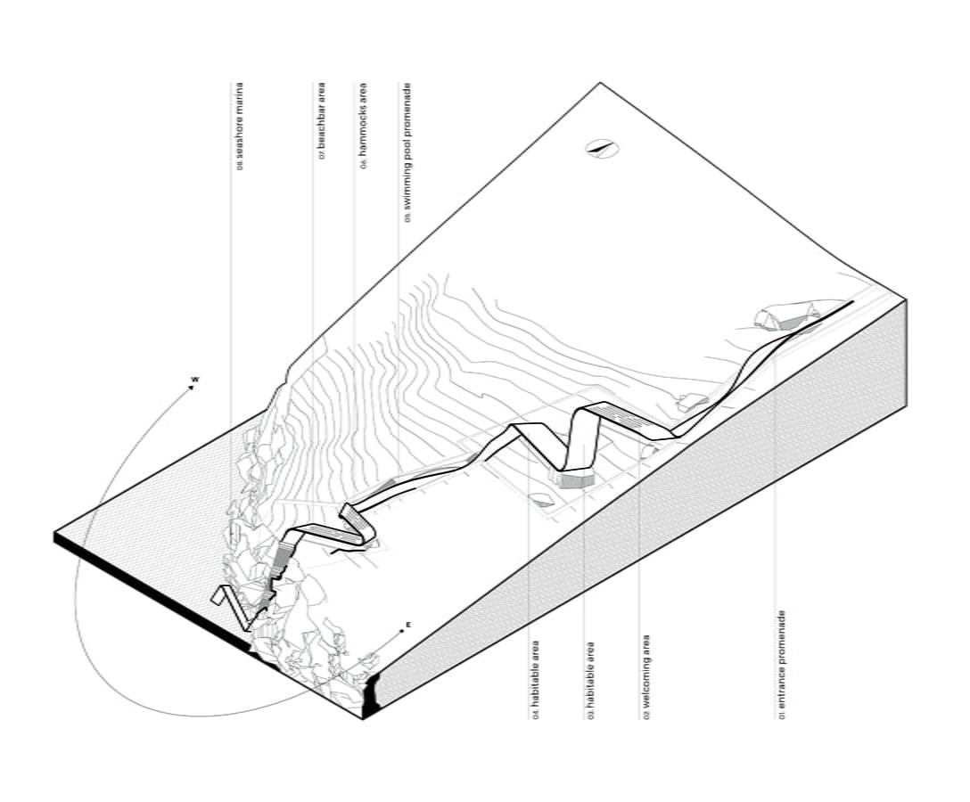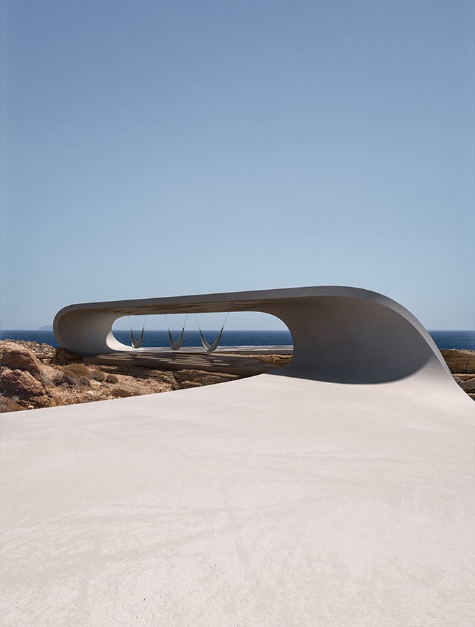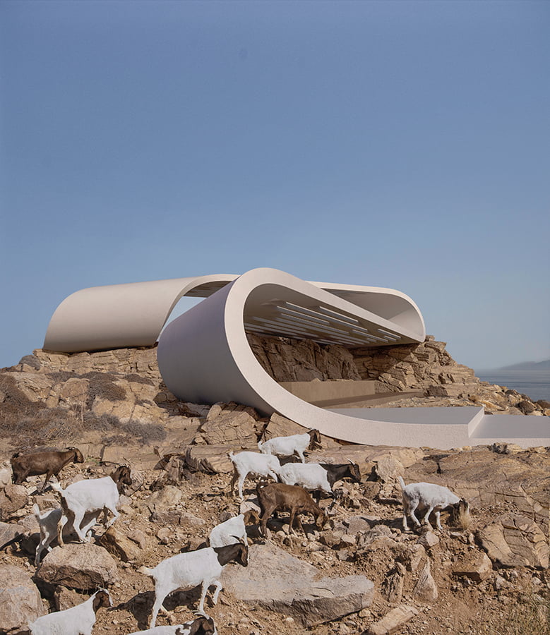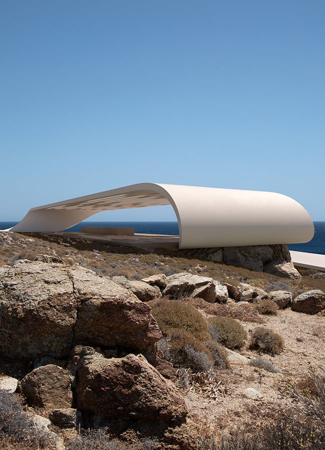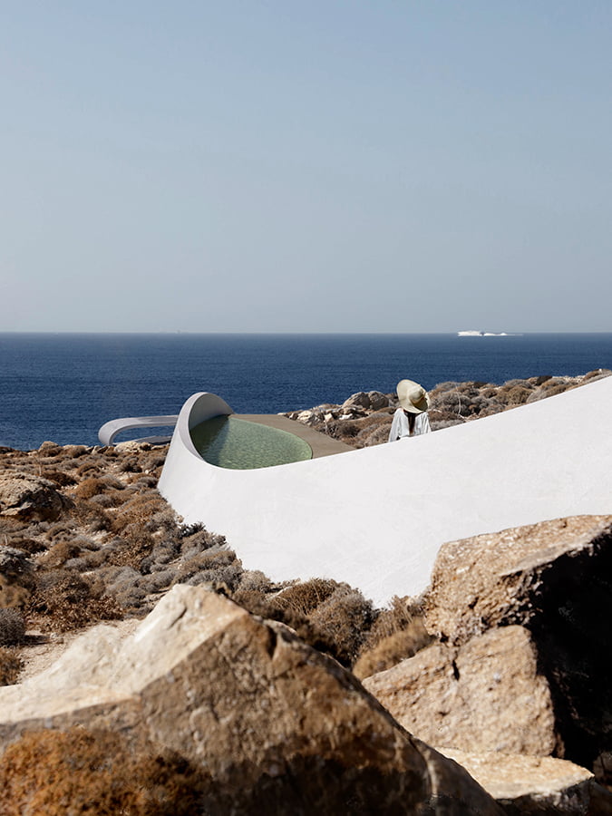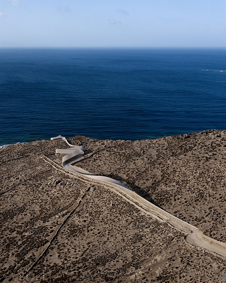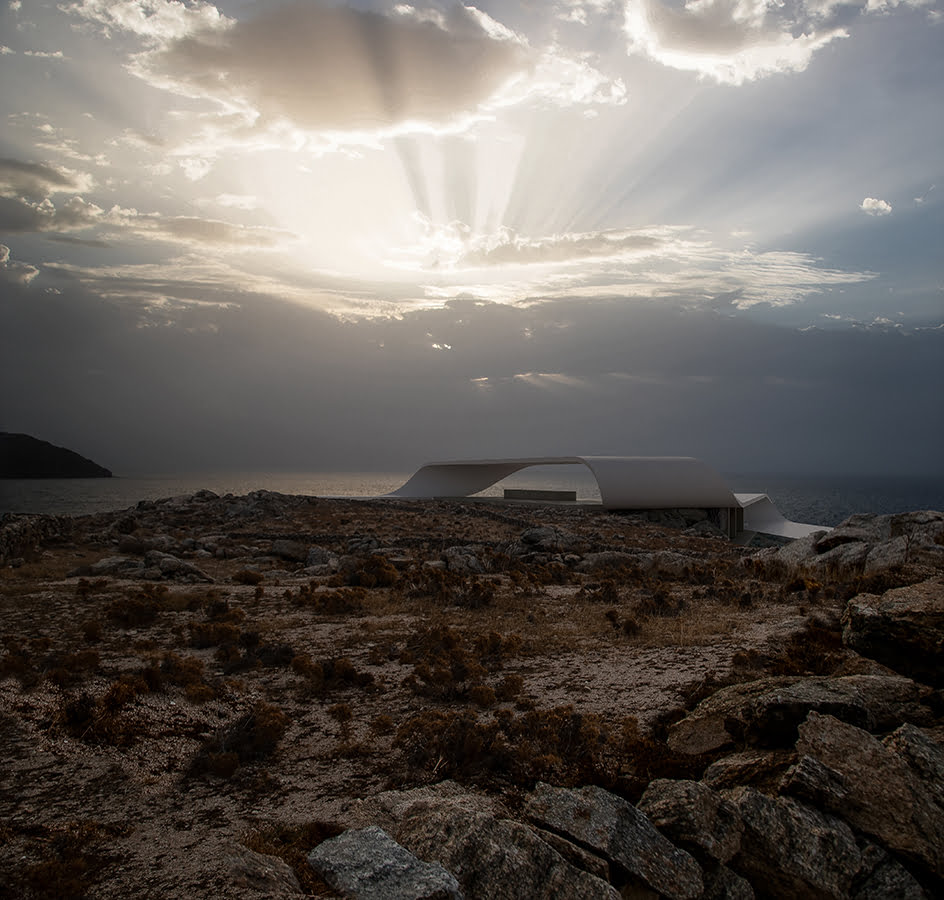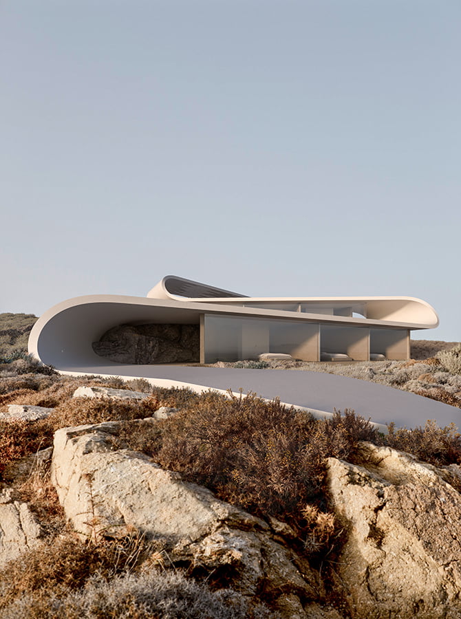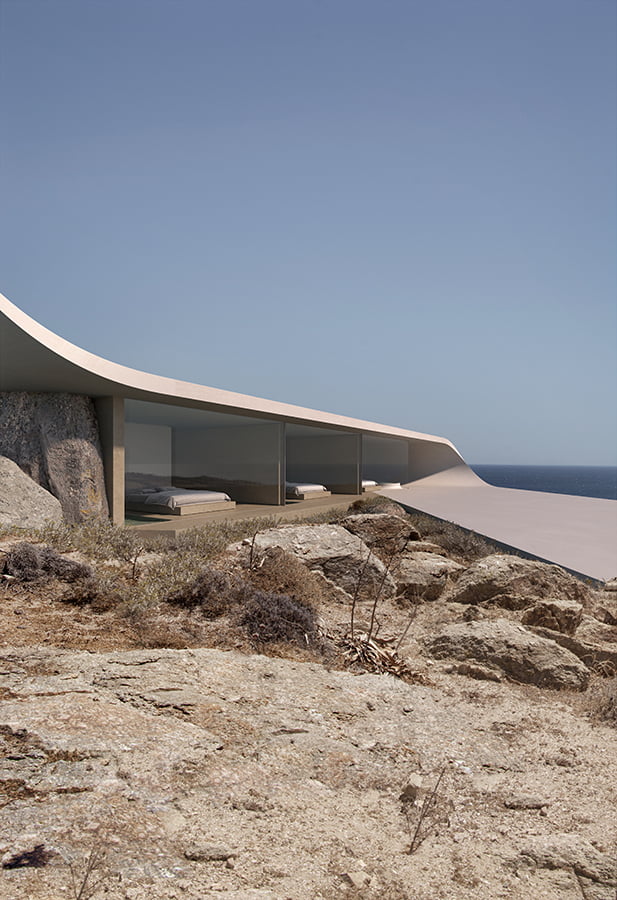 The unique, wild Cycladic landscape combined with the strange plot geometry gave birth to the concept idea of this villa. Rock and wind are the only architectural elements used, everything else is completely unnecessary. These elements are in a constant harmonious interaction and unfold linearly along the plot, swirling, arguing, kissing, sinking into the earth and emerging again, until they finally end up in the sea.