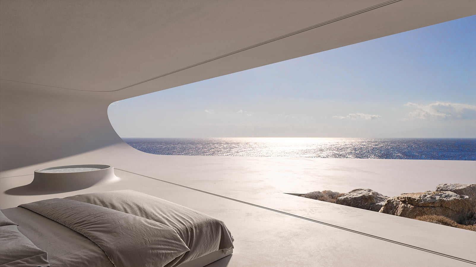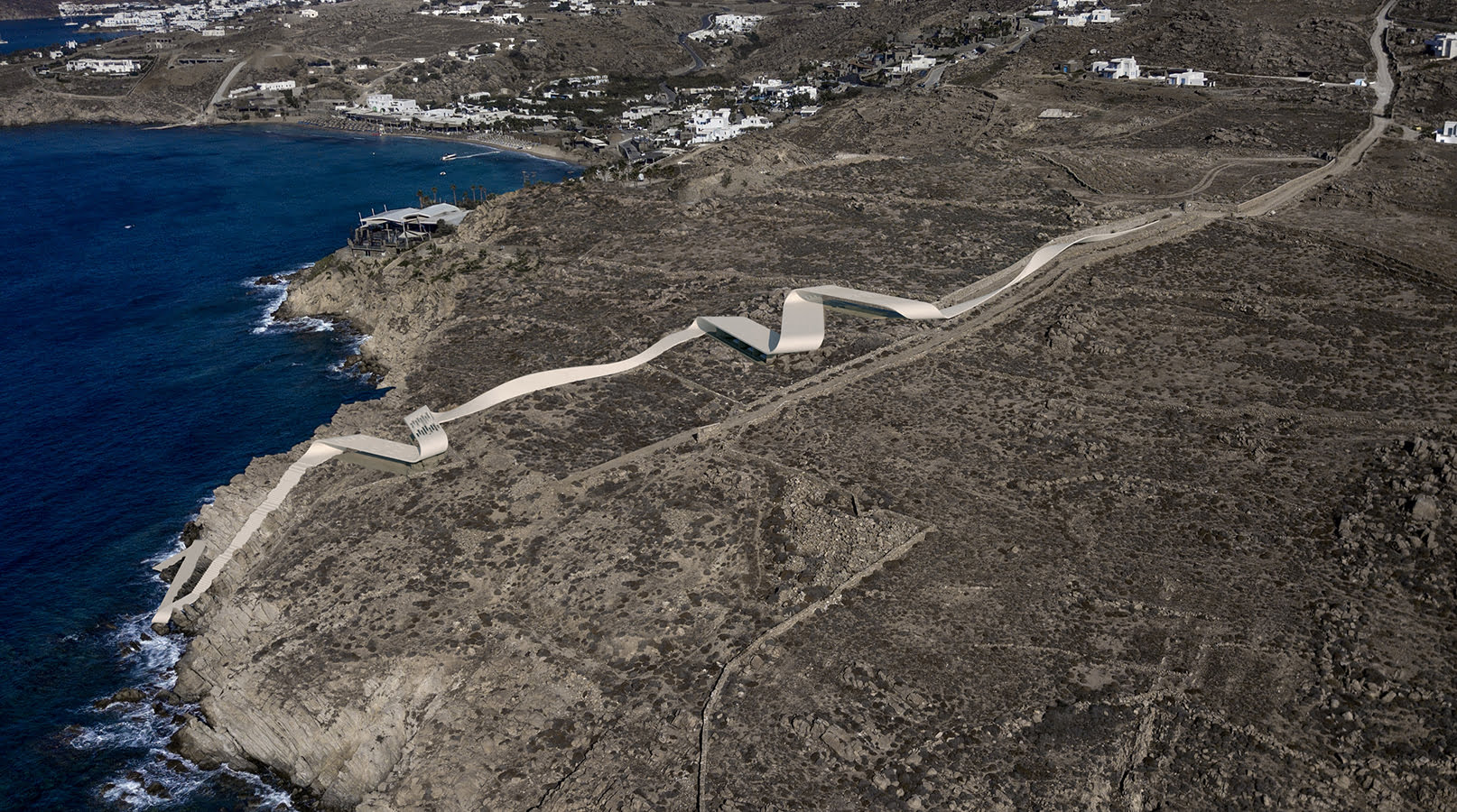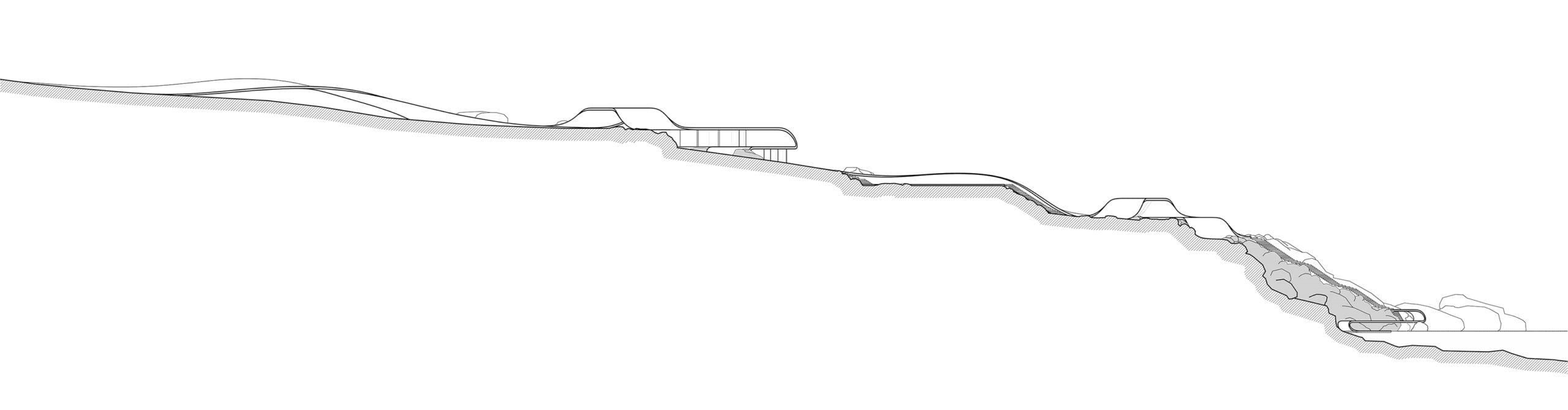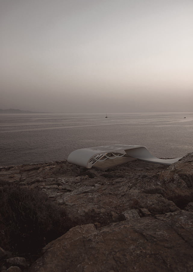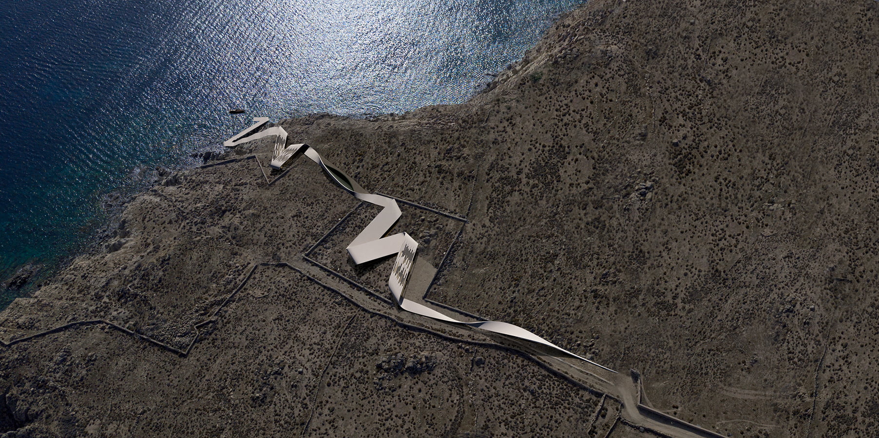 The unique, wild Cycladic landscape combined with the strange plot geometry gave birth to the concept idea of this villa. Rock and wind are the only architectural elements used, everything else is completely unnecessary. These elements are in a constant harmonious interaction and unfold linearly along the plot, swirling, arguing, kissing, sinking into the earth and emerging again, until they finally end up in the sea.
