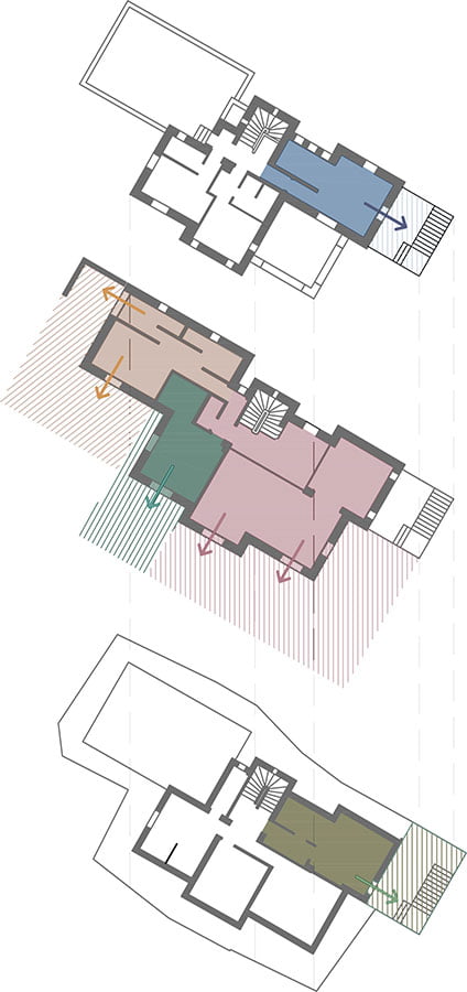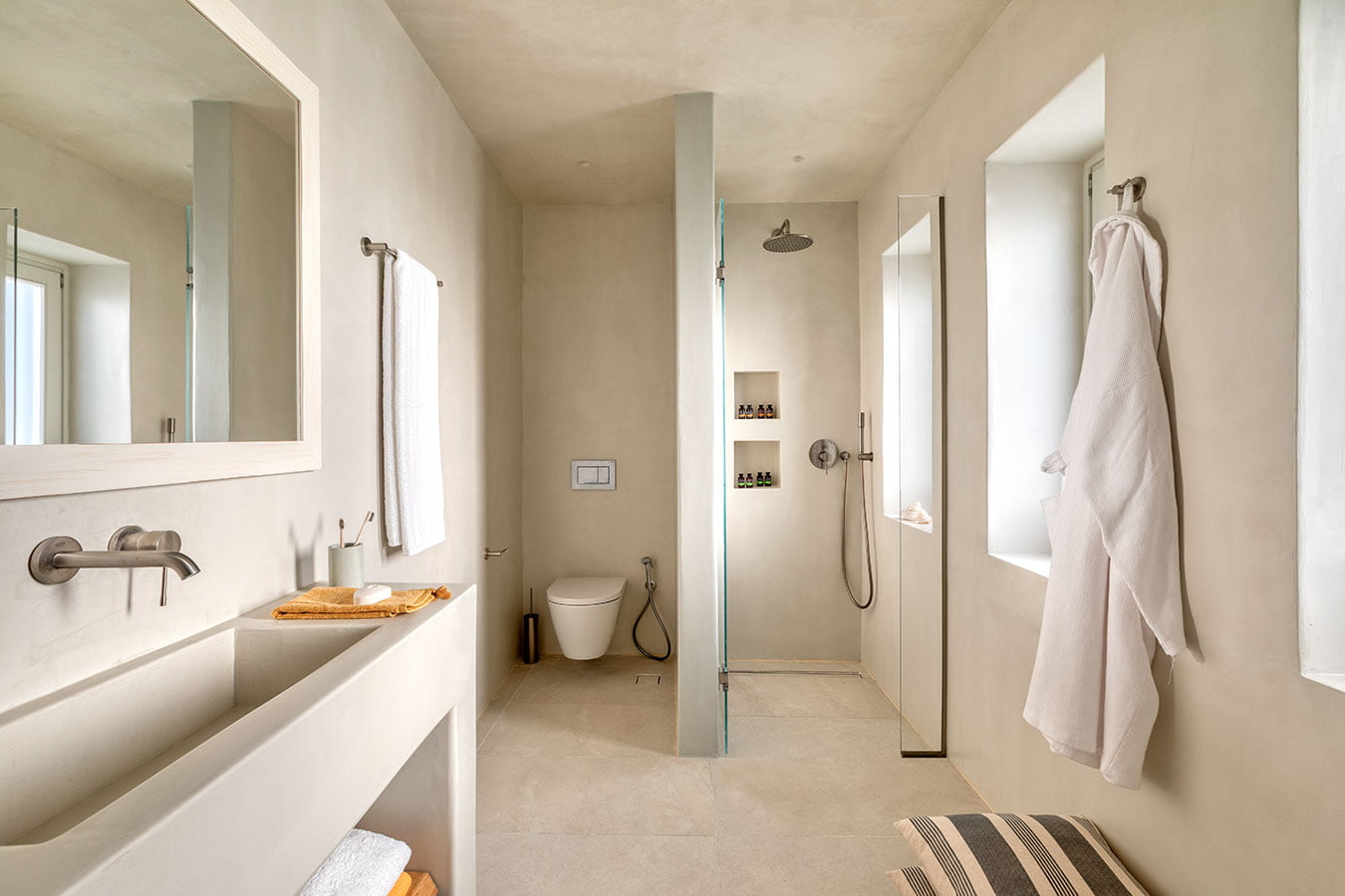 Wooden panels, thin metal elements and glass surfaces allow light to diffuse inside the rooms, while at the same time allowing or preventing the visual exposure of the occupants in public view. Emphasis was placed on the preservation of natural colors, both indoors and outdoors, with tones borrowed from the island’s color palette. The architectural elements that are added are combined with the existing ones, following the steep slope of the ground, in order to highlight the place itself as a dominant element.