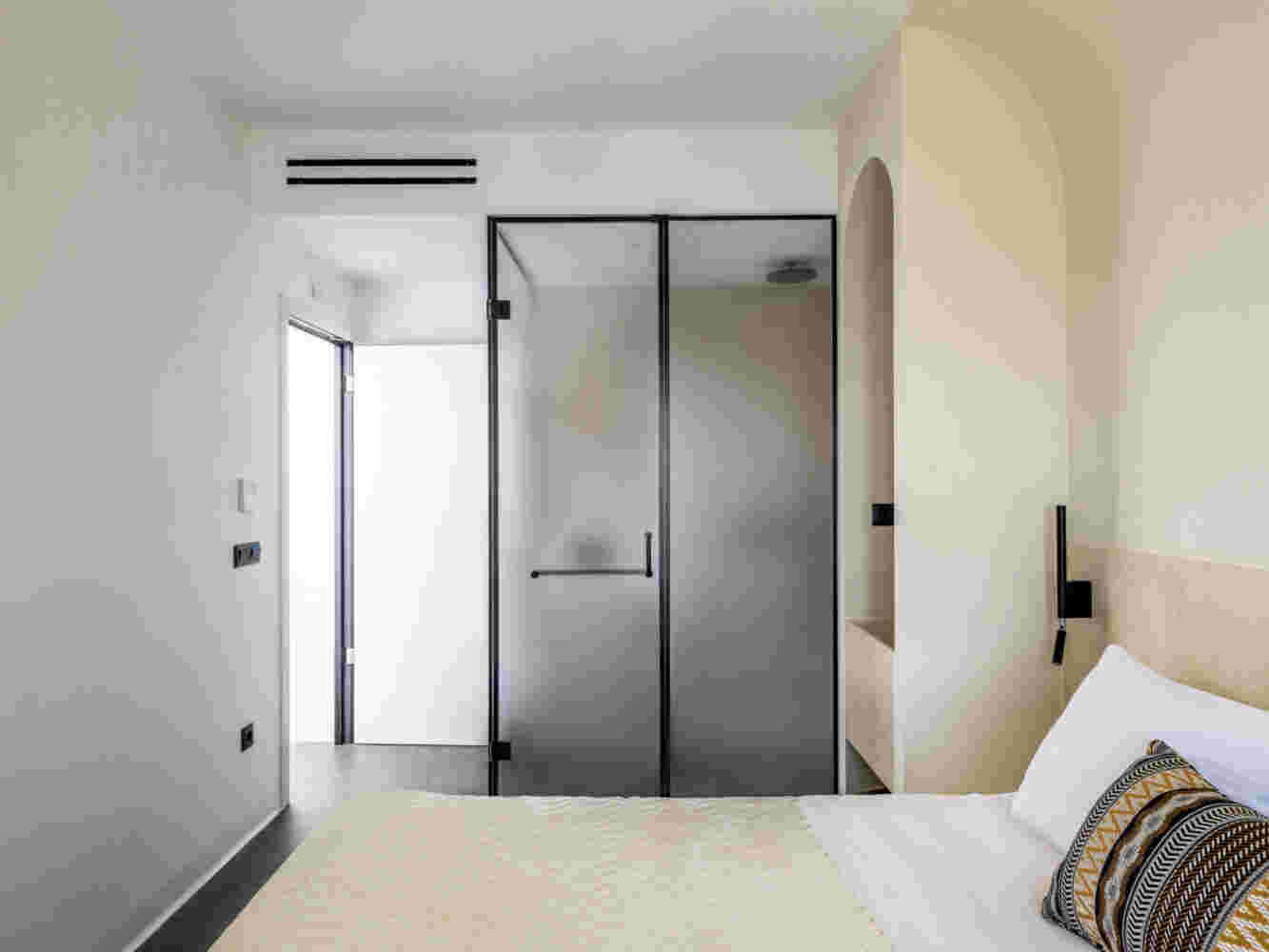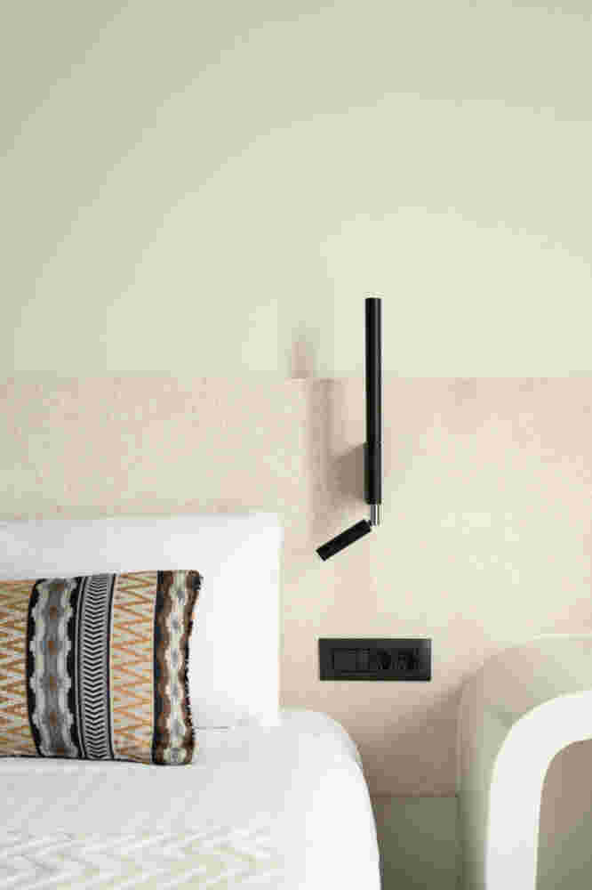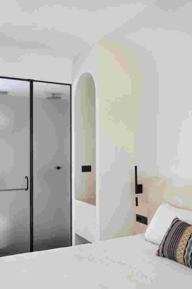 The main synthetic gesture is a delicate balance between opposing concepts, such as old/new, empty/full, local/global, rough/smooth, and straight/curved. A decisive factor was maximizing the space without making the rooms appear cluttered. To achieve this, all the main functions of the room have been moved to one side, something that is also reflected in its different coloring. Bright colors such as off-white and cream were chosen to allow natural light to reflect and create bright spaces. Additionally, these colors are abundant on the island and thus reinforce the hotel’s connection to the traditional aesthetic that has emerged in Mykonos.